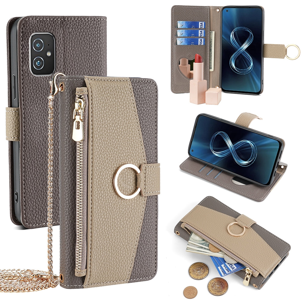 Asus Zenfone 8 ZS590KS Crossbody Phone Case with Litchi Texture Leather, Adjustable Kickstand, Card Slots, Zipper Purse, Makeup Mirror, and TPU Protection