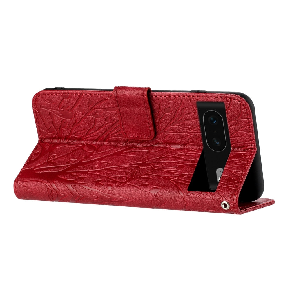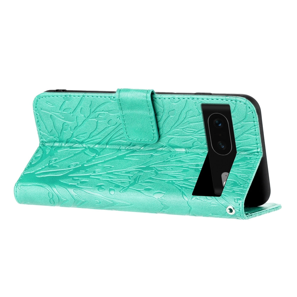 Google Pixel 7 Embossed Leather Phone Case with Tree Birds Pattern, Hand Strap, Card Holder & Adjustable Stand - Shockproof Wallet Cover