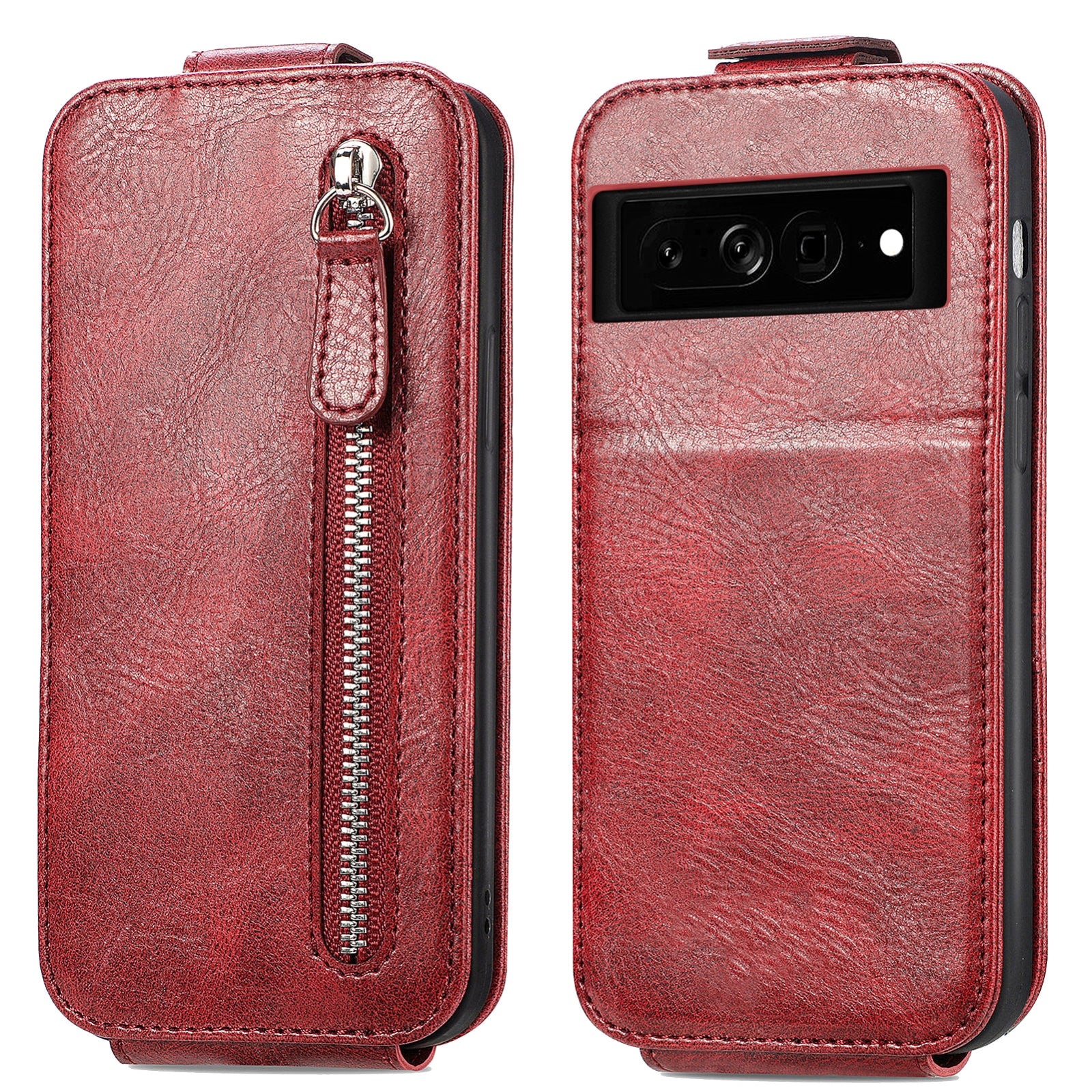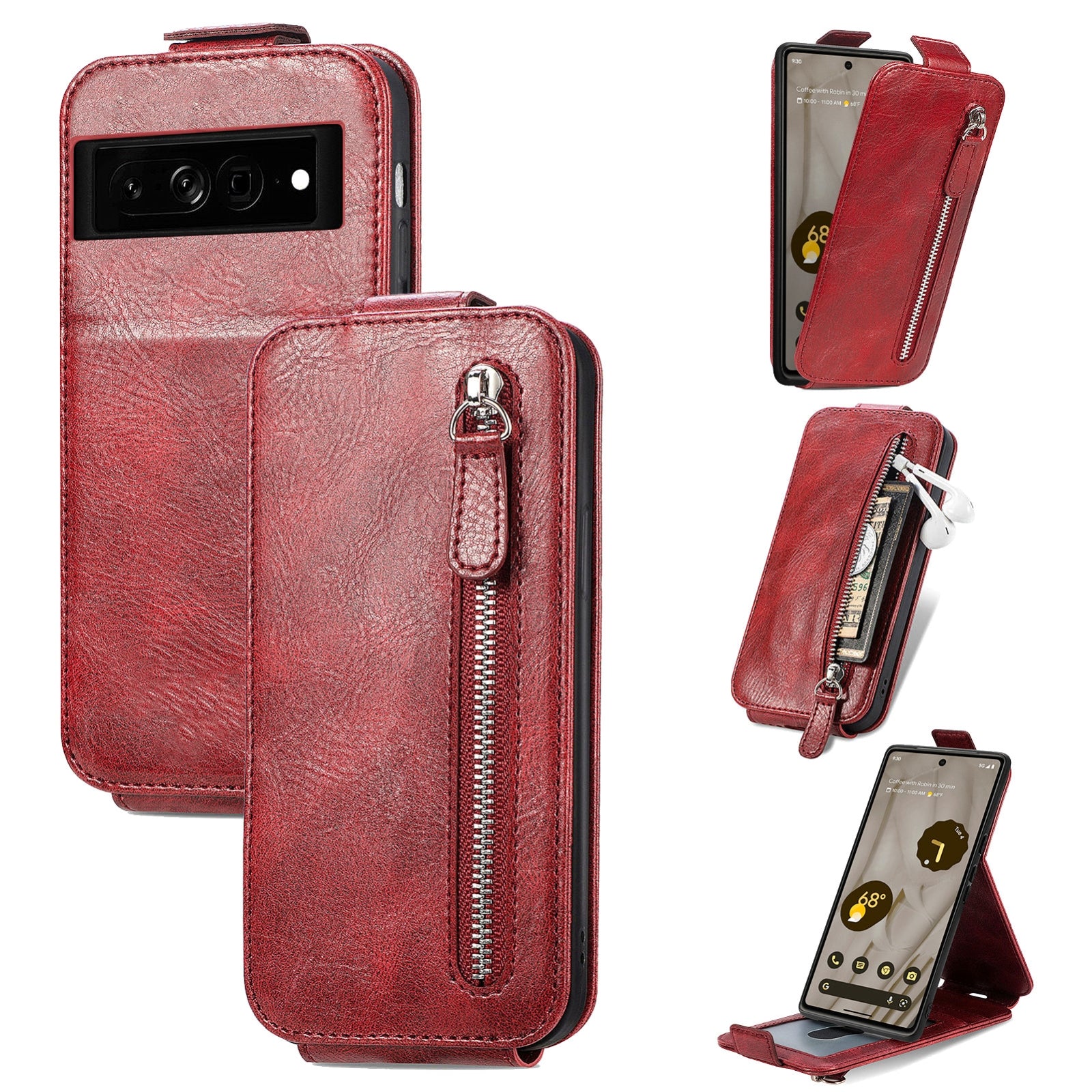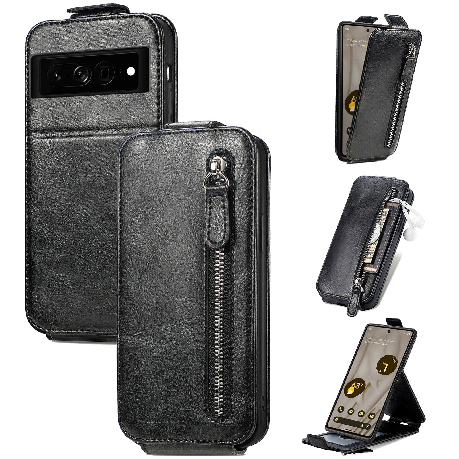 Google Pixel 7A Zipper Wallet Case - Vertical Flip Leather Phone Cover with Multiple Card Slots and Stand