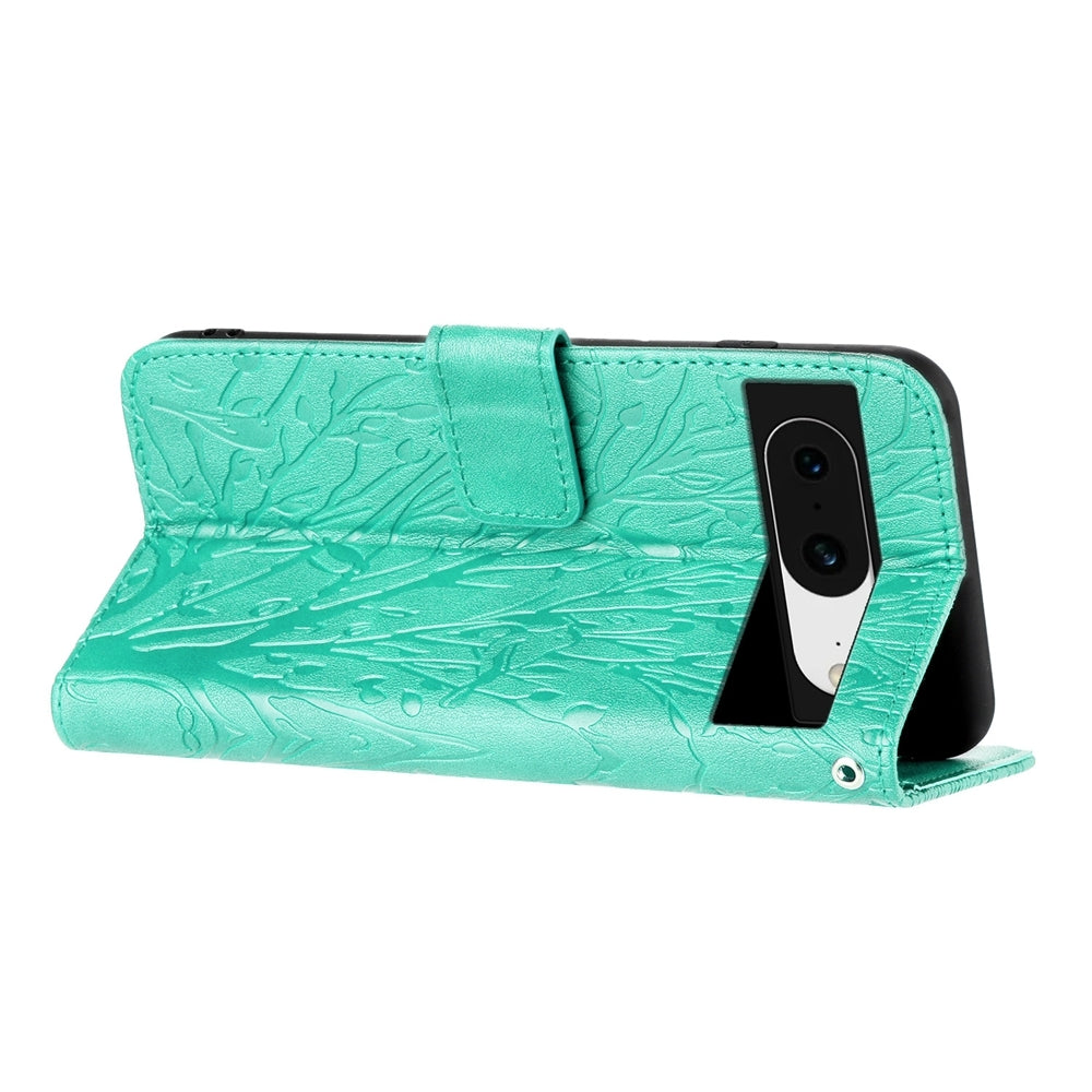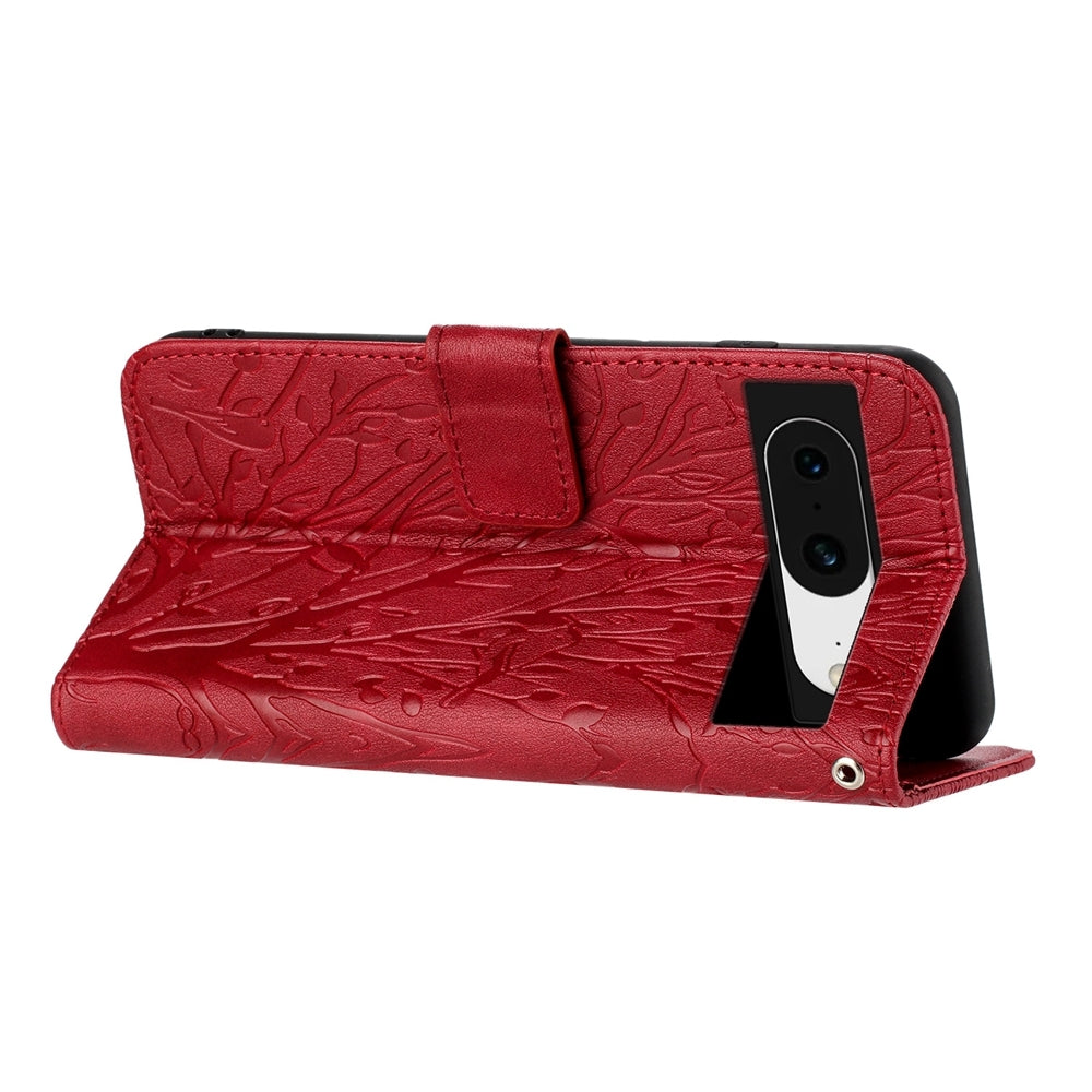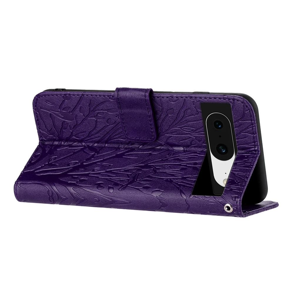 Google Pixel 8 Embossed Leather Phone Case with Tree Birds Pattern, Hand Strap, Card Holder & Adjustable Stand - Shockproof Wallet Cover