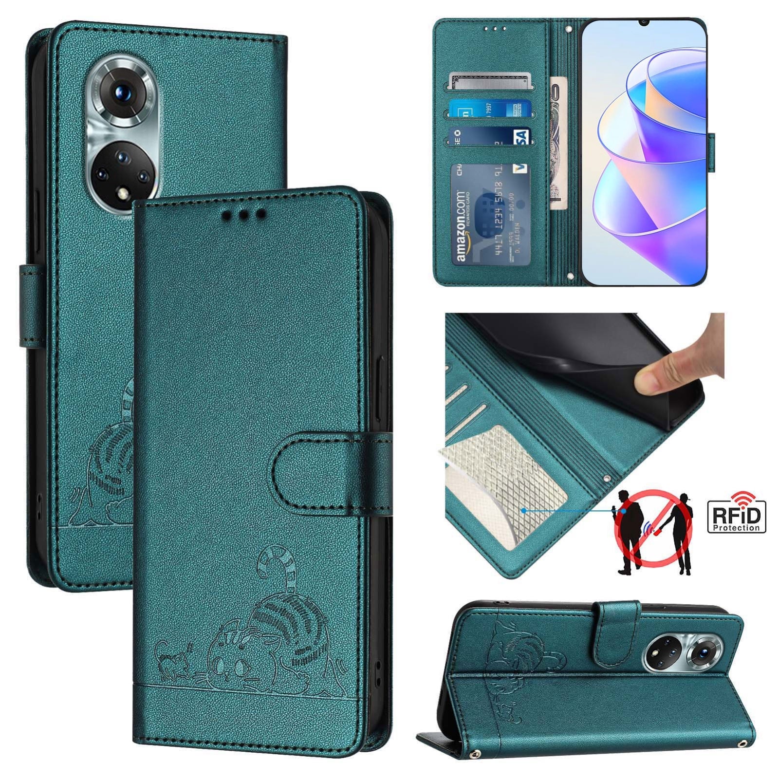 Honor 50 Pro Cat and Rat Embossed Pattern, RFID Leather Phone Case with Lanyard, Kickstand, and Wallet Features