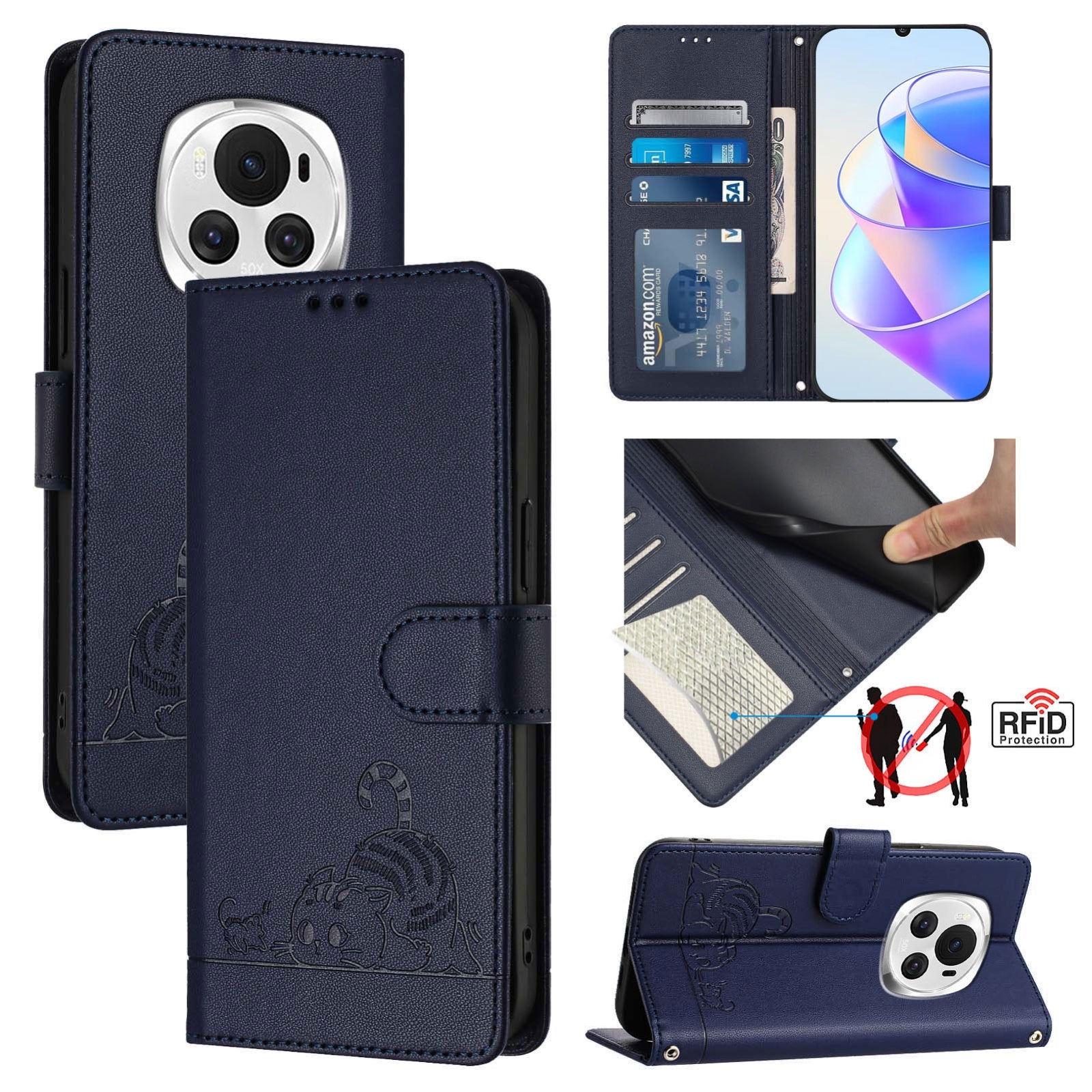 Honor Magic6 5G Global Cat and Rat Embossed Pattern, RFID Leather Phone Case with Lanyard, Kickstand, and Wallet Features