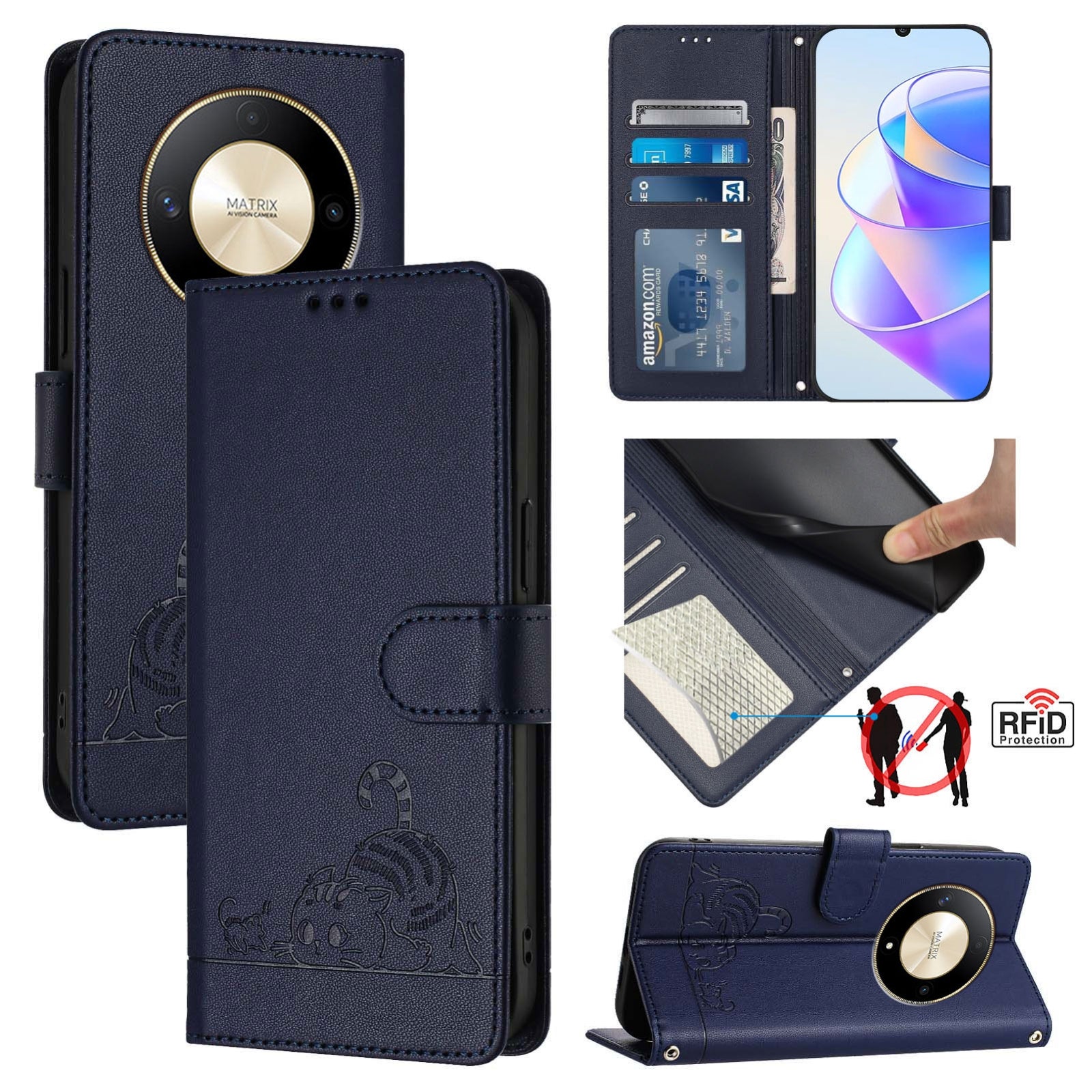 Honor Magic6 Lite 5G Global Cat and Rat Embossed Pattern, RFID Leather Phone Case with Lanyard, Kickstand, and Wallet Features