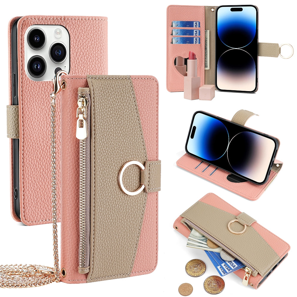 iPhone 14 Pro Crossbody Phone Case with Litchi Texture Leather, Adjustable Kickstand, Card Slots, Zipper Purse, Makeup Mirror, and TPU Protection