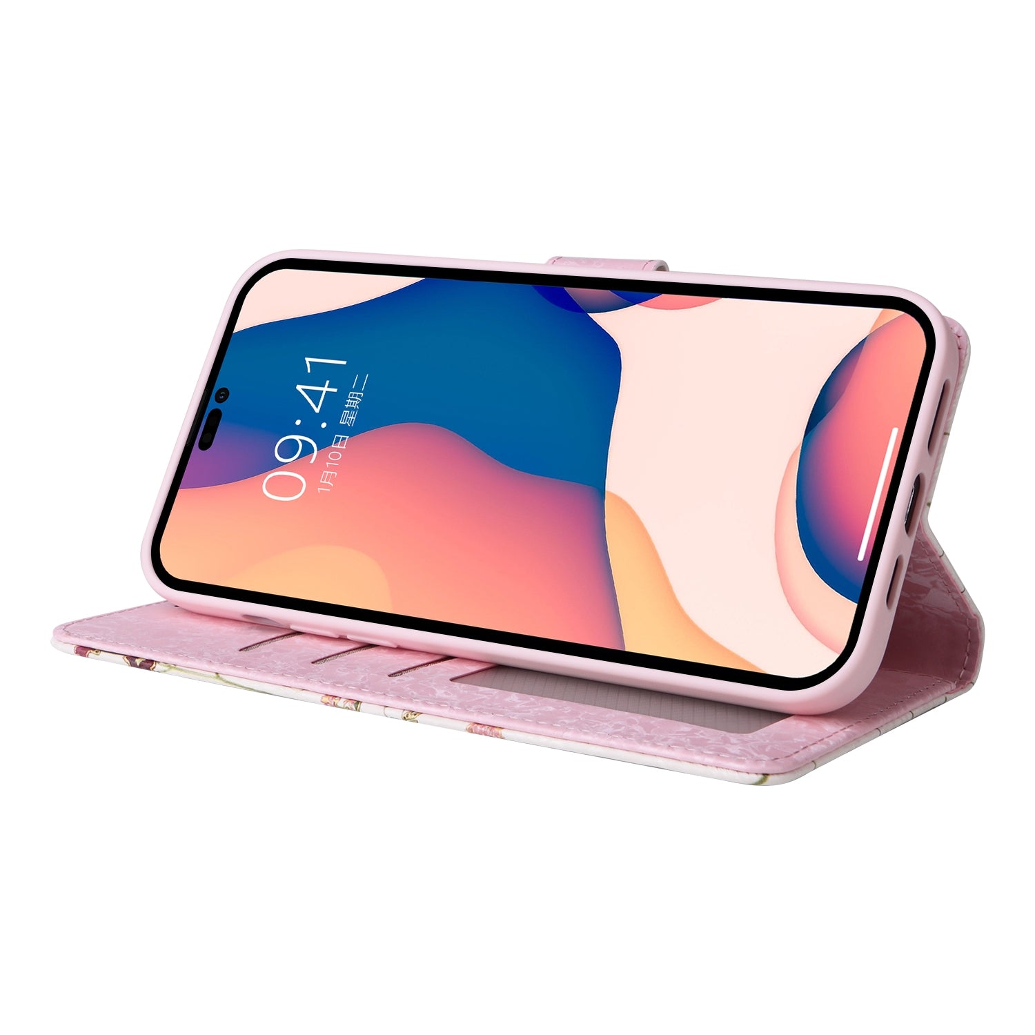 iPhone 14 Pro Max Luxury Bronzing Leather Case - Floral RFID Wallet Cover with Stand & Card Slots