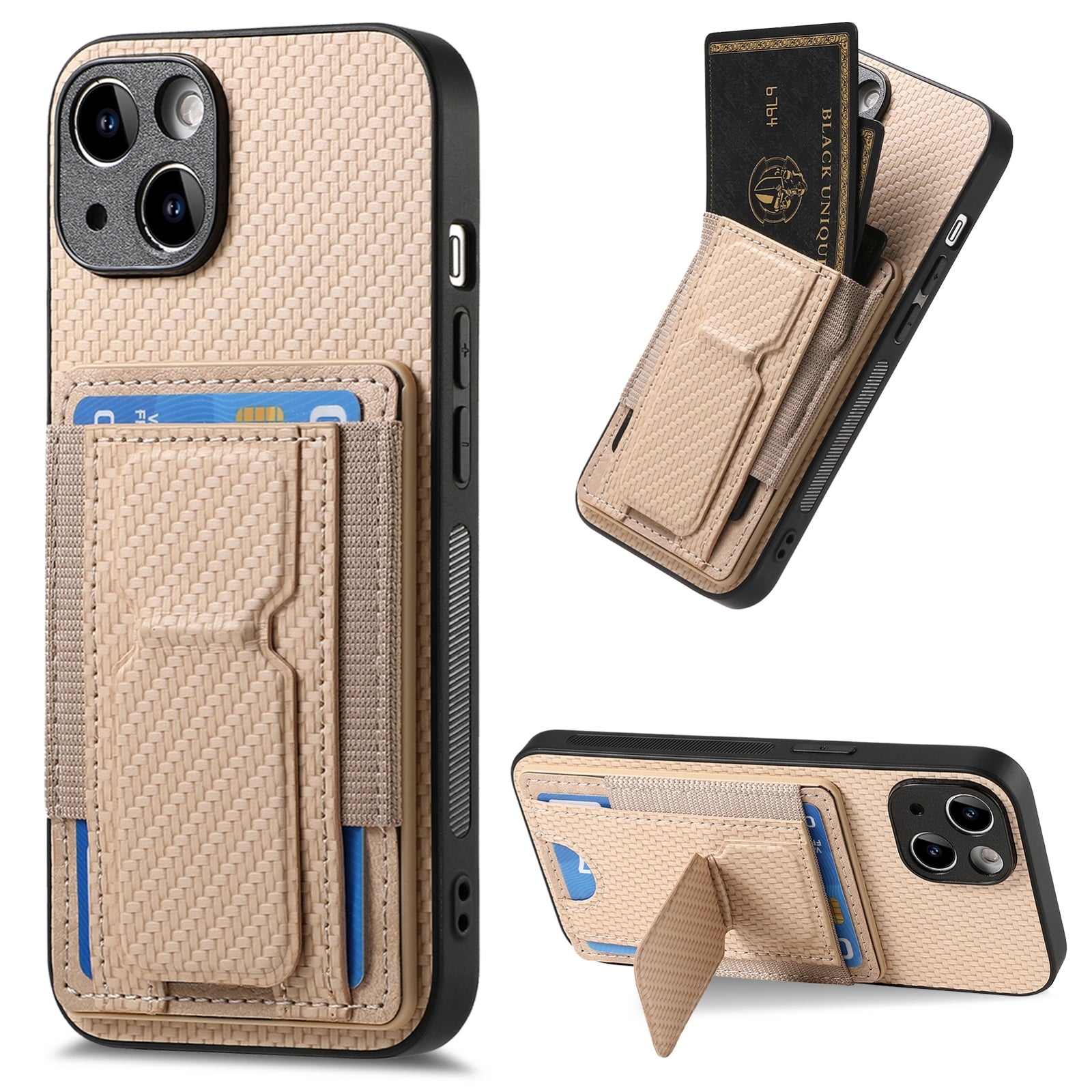 iPhone 15 Plus Carbon Fiber Fold Stand Elastic Card Bag Phone Case with Multi-Functional Wallet