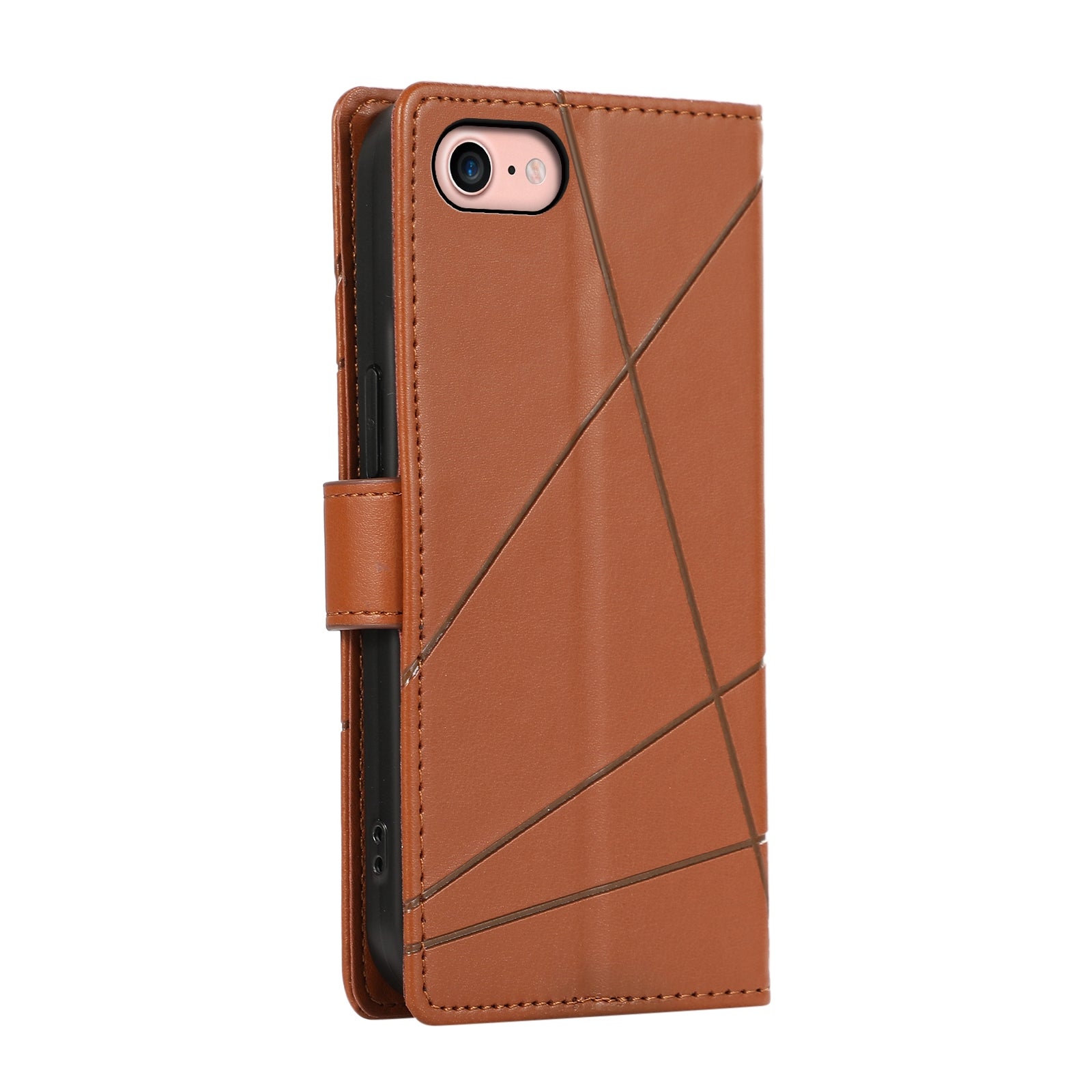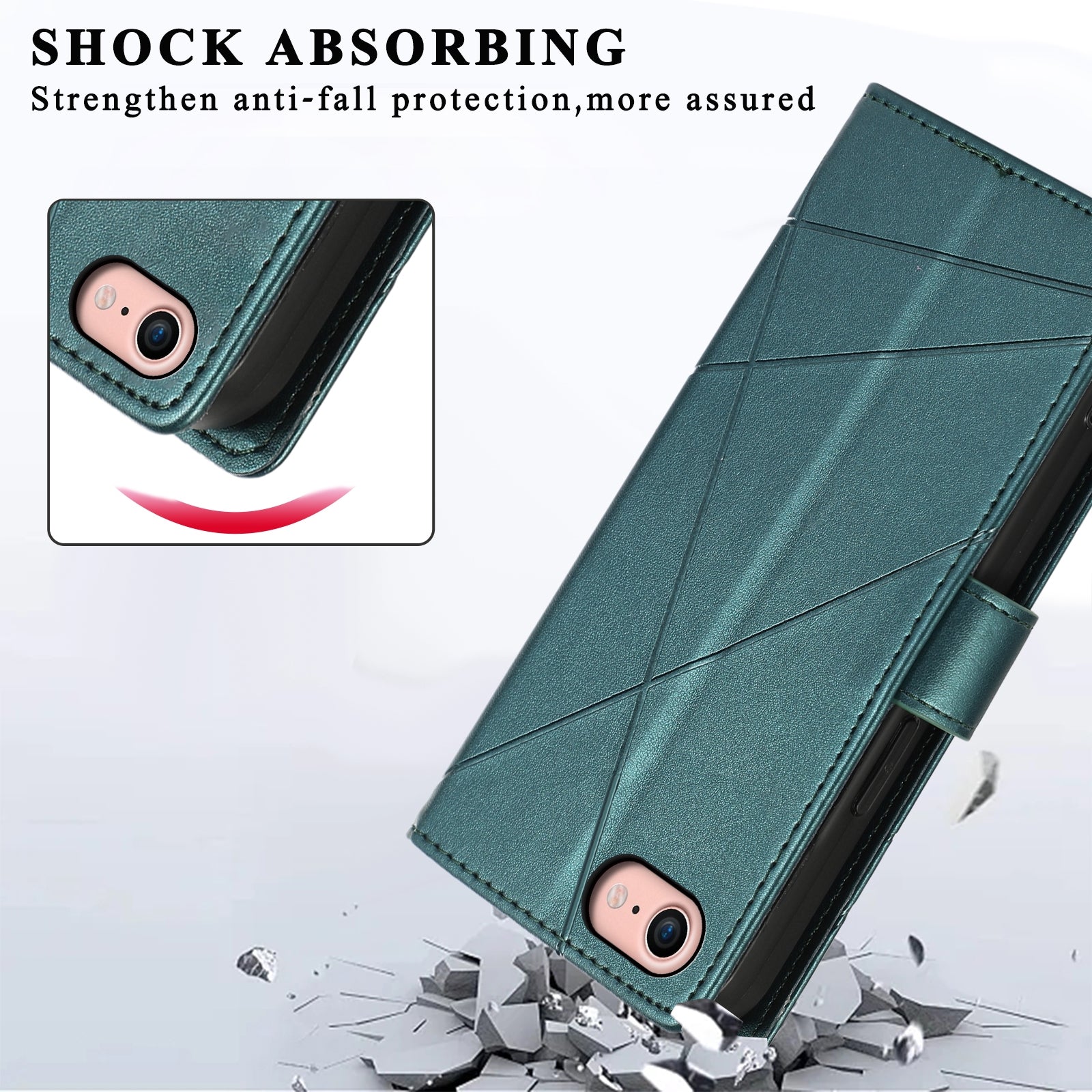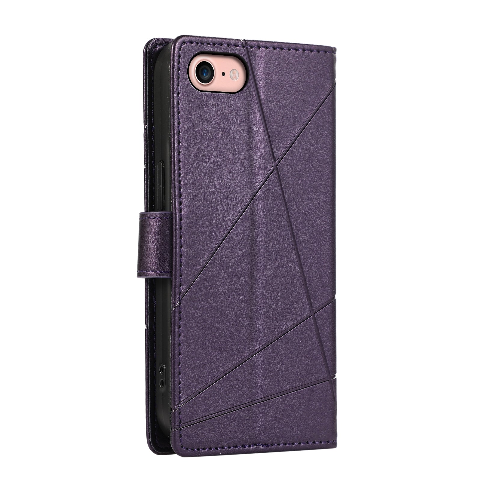 iPhone SE 2022/SE 2020 PU Genuine Leather Texture Embossed Line Phone Case with Card Wallet, Kickstand & Wrist Strap