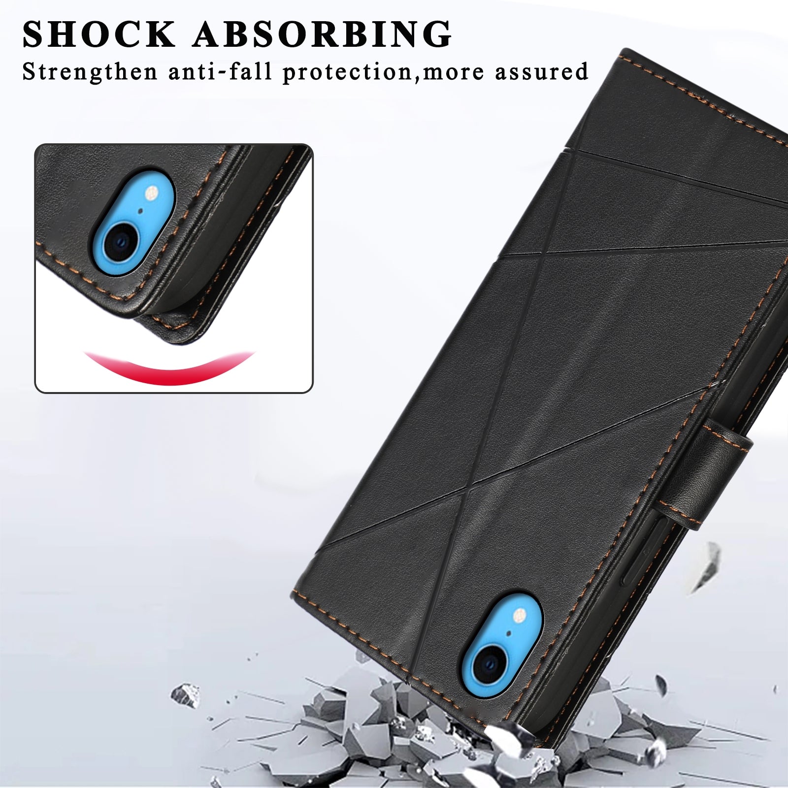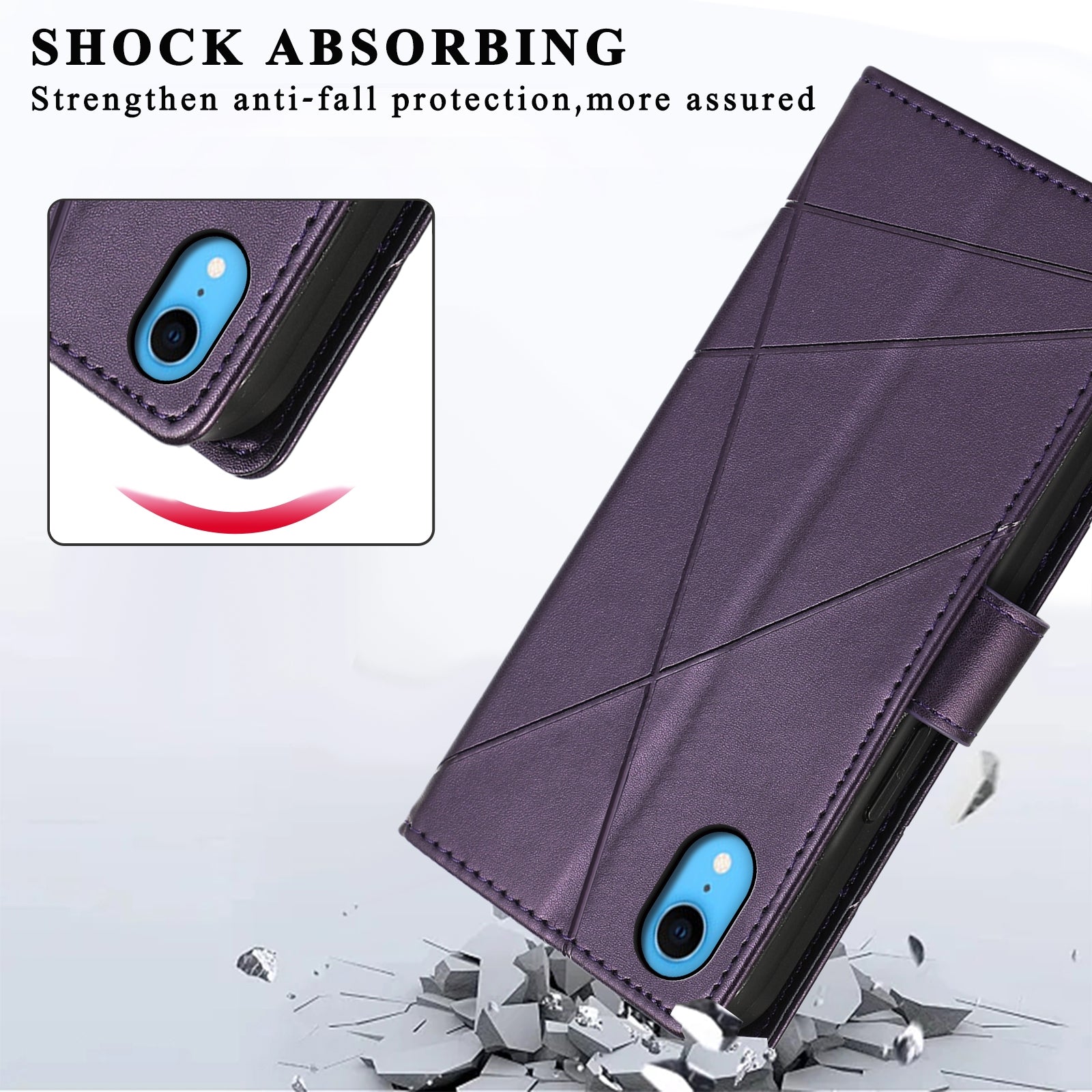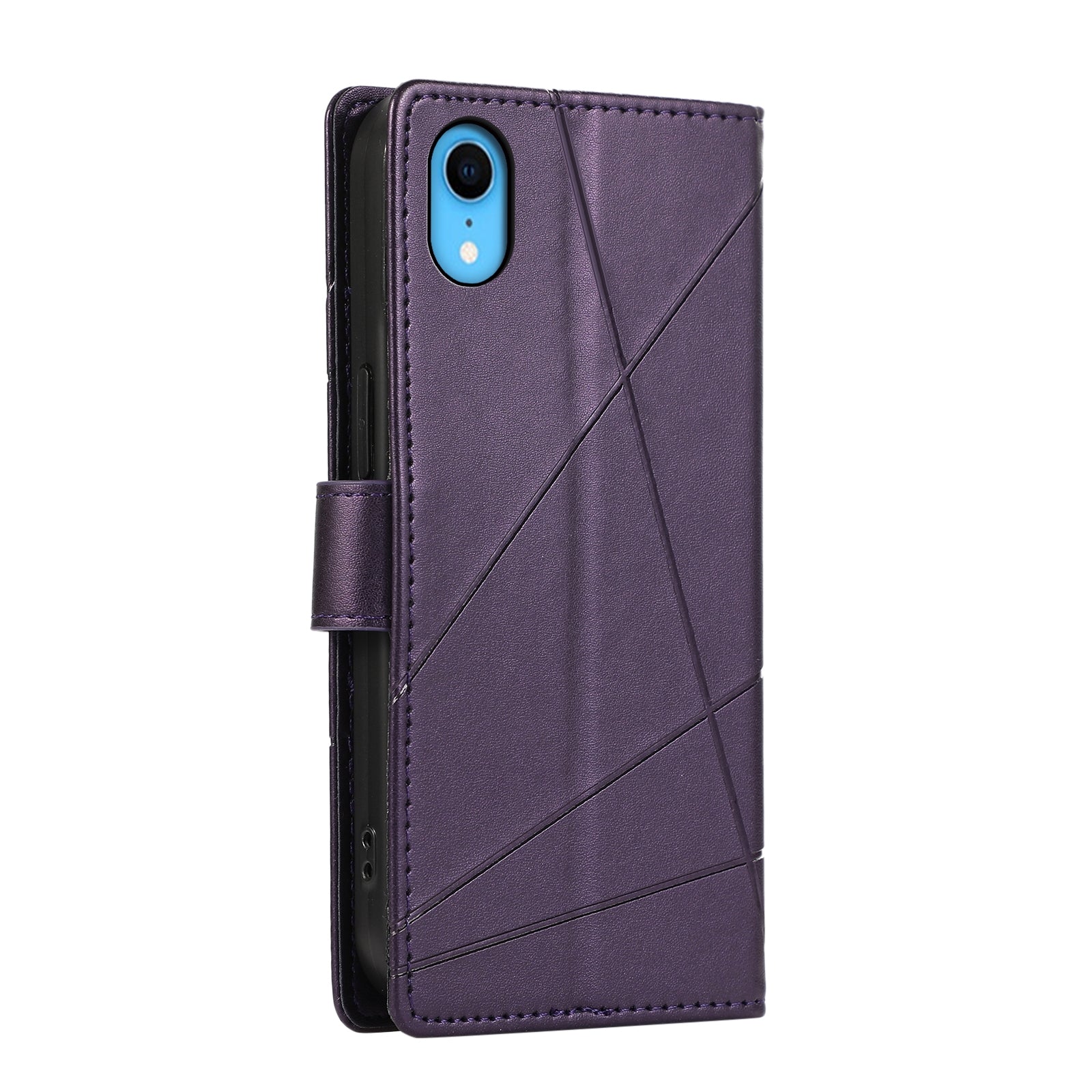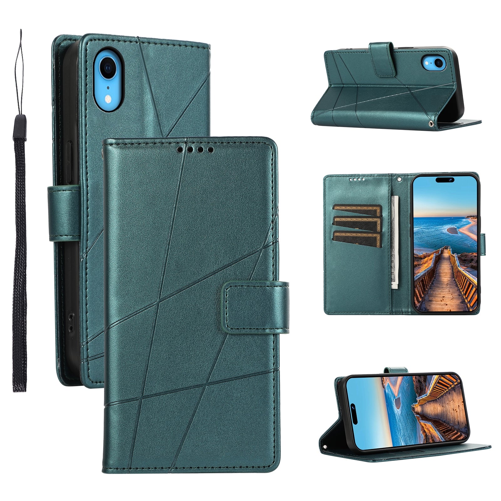 iPhone XR PU Genuine Leather Texture Embossed Line Phone Case with Card Wallet, Kickstand & Wrist Strap