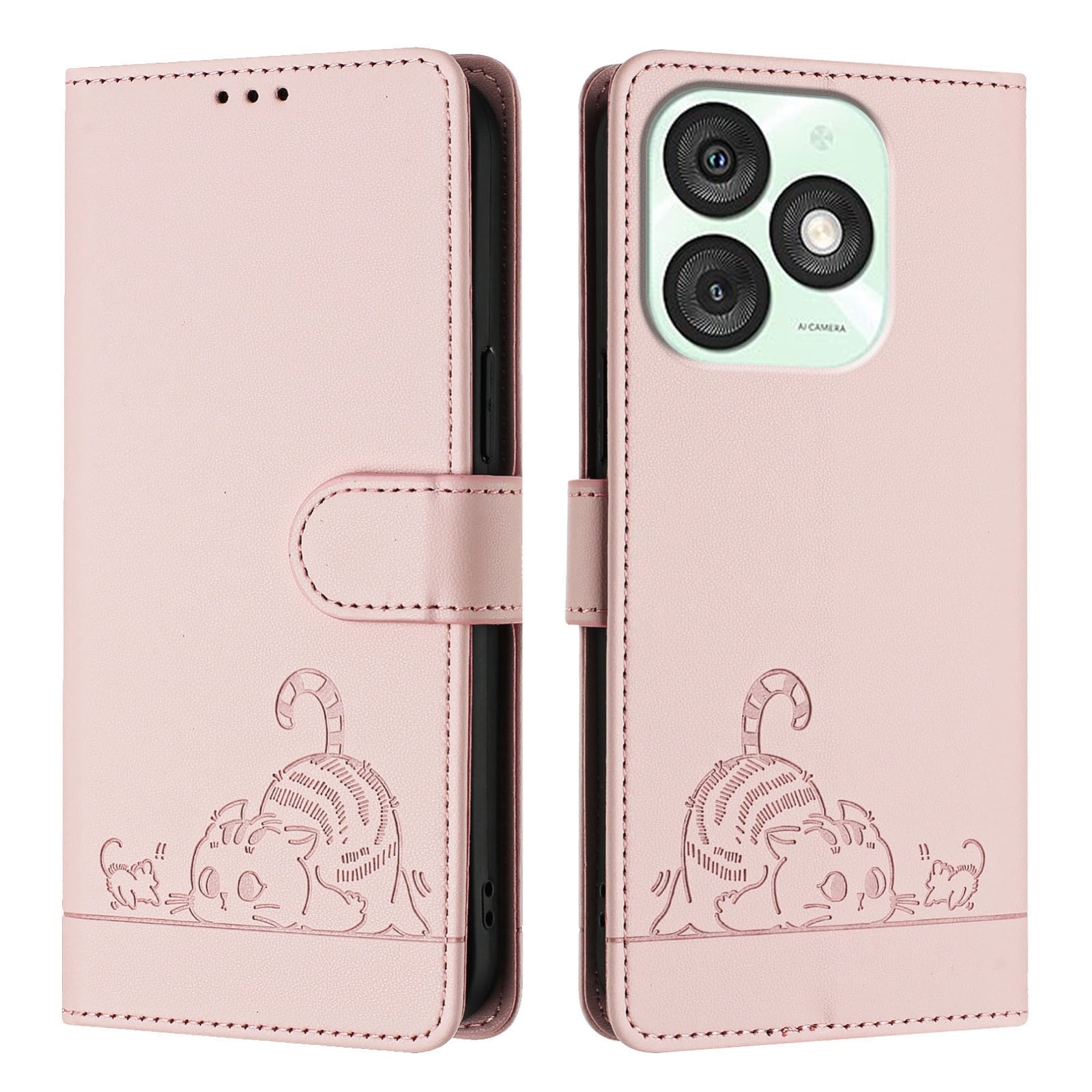 Explore the perfect blend of style and functionality with our itel A50 Leather Phone Case. Featuring a charming cat and rat embossed pattern, this case offers multiple benefits: