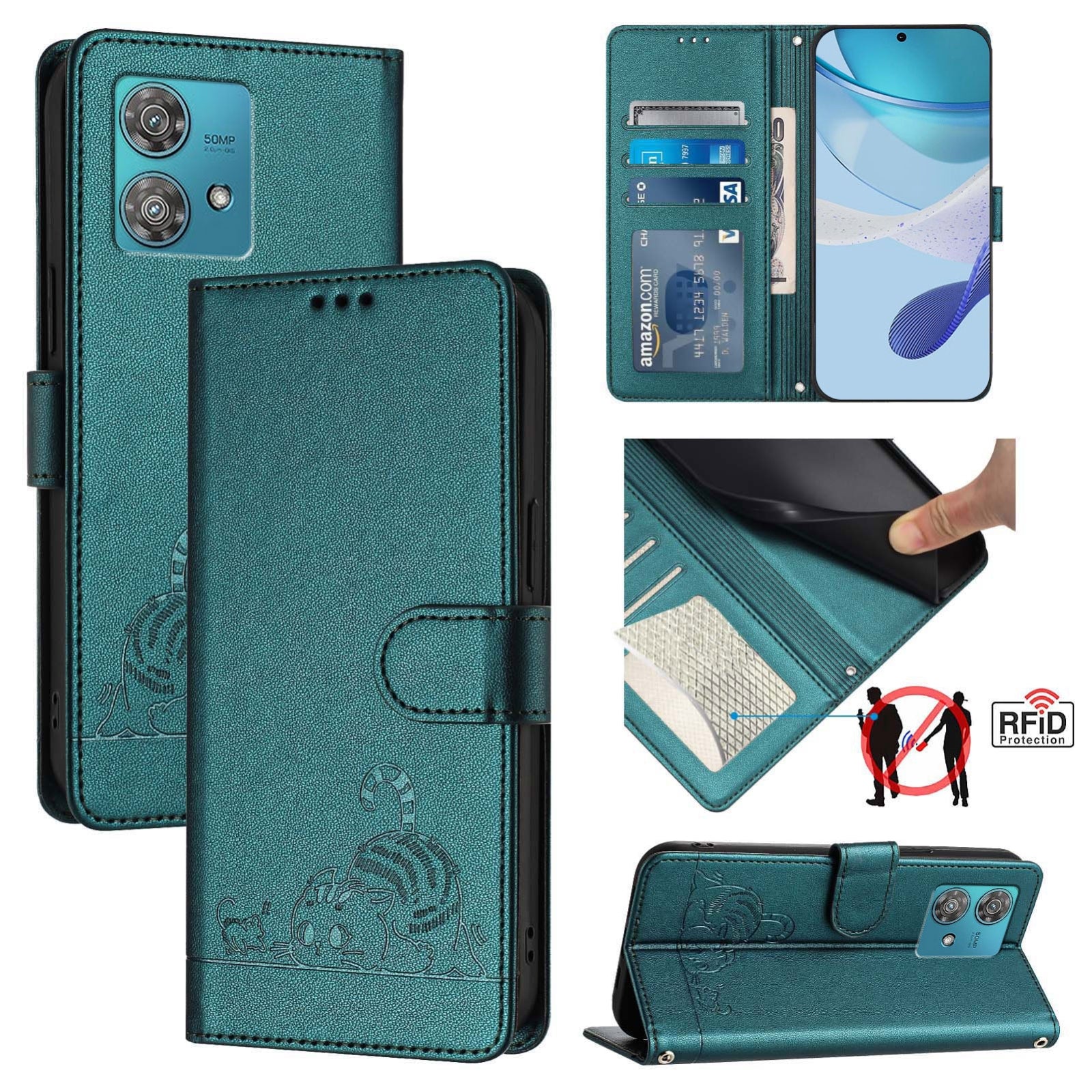 Motorola Edge 40 Neo 5G Cat and Rat Embossed Pattern, RFID Leather Phone Case with Lanyard, Kickstand, and Wallet Features