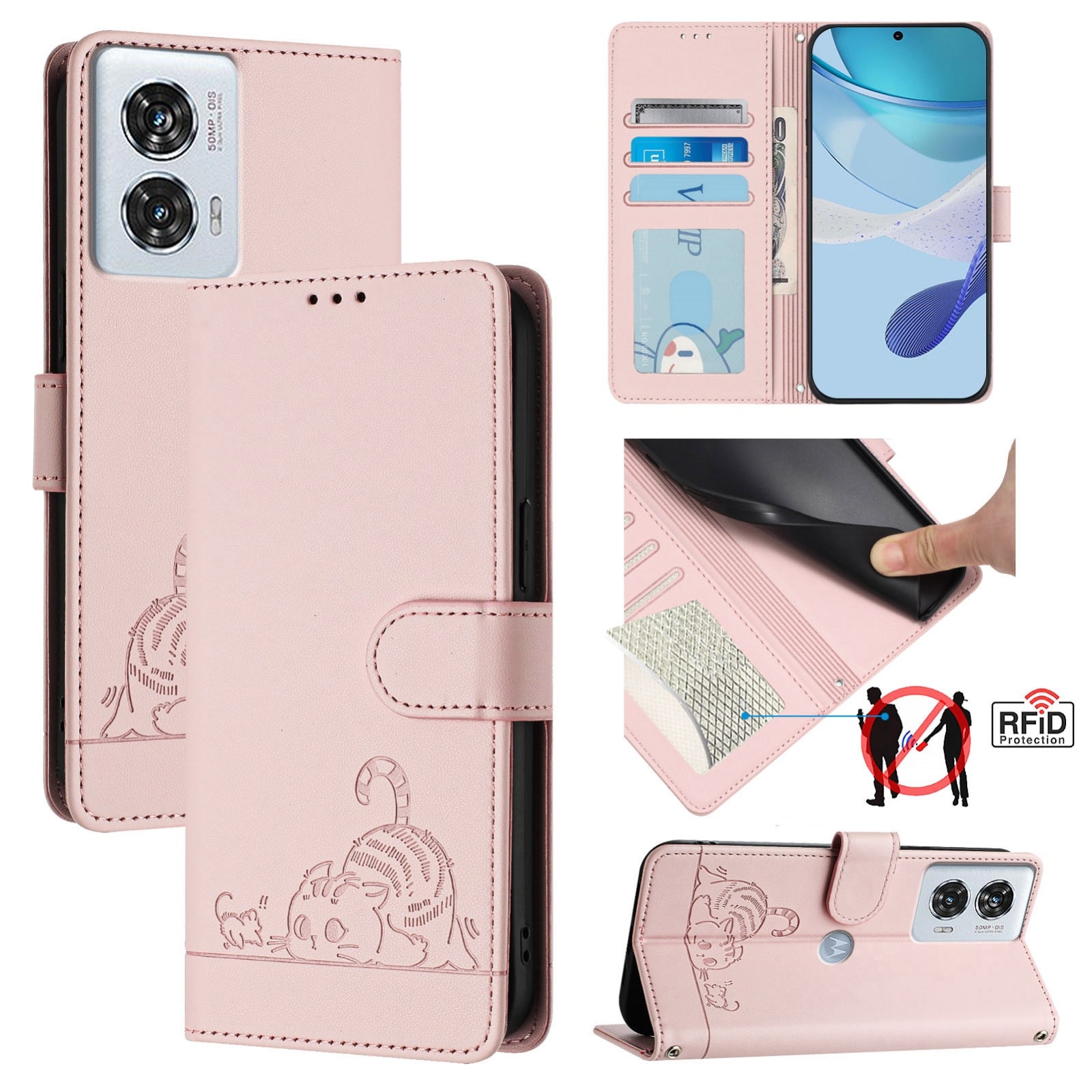 Motorola Edge 50 Fusion Cat and Rat Embossed Pattern, RFID Leather Phone Case with Lanyard, Kickstand, and Wallet Features