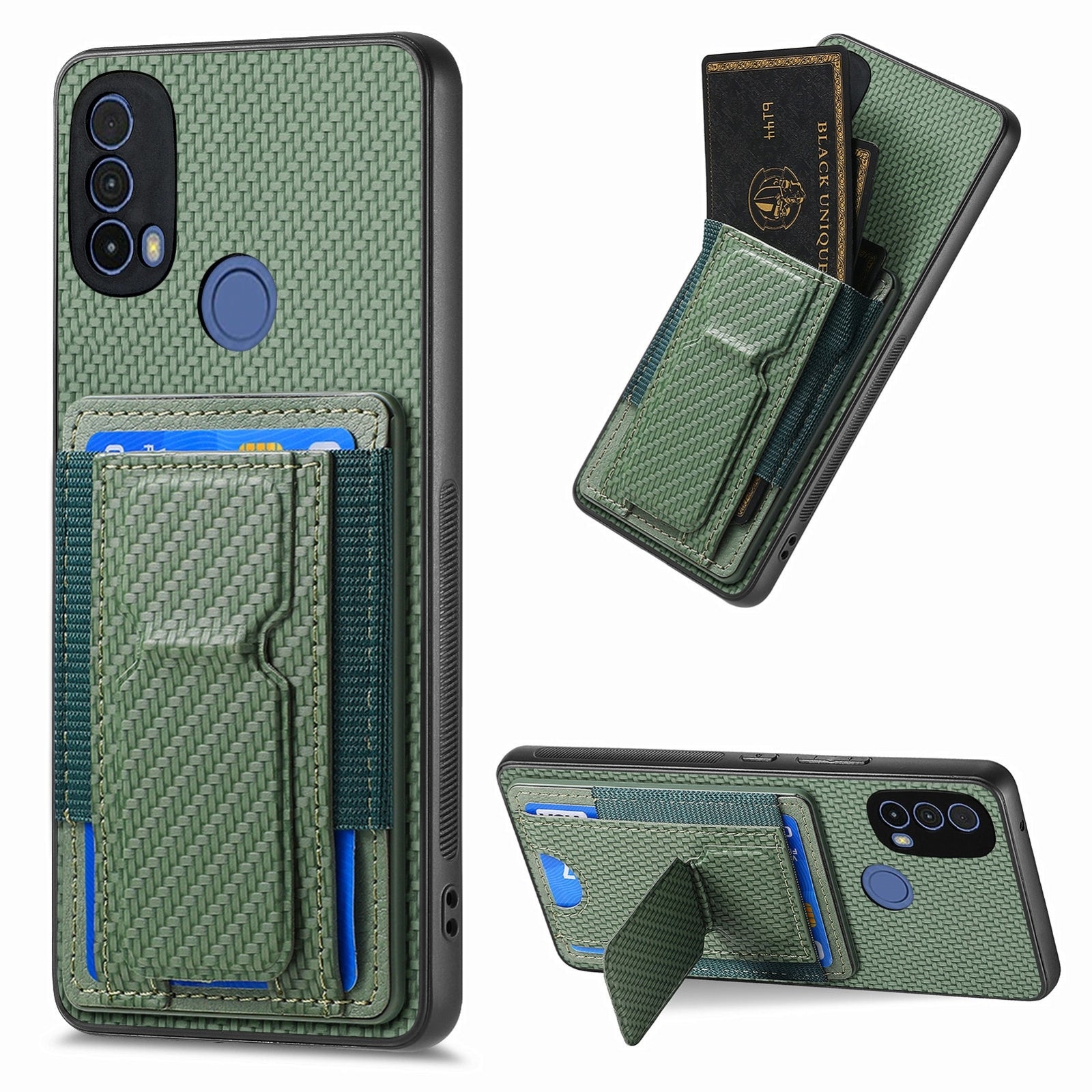 Motorola Moto E40 Carbon Fiber Fold Stand Elastic Card Bag Phone Case with Multi-Functional Wallet