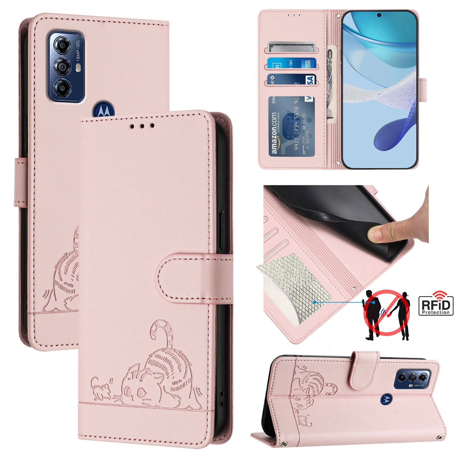Motorola Moto G Play 2023 Cat and Rat Embossed Pattern, RFID Leather Phone Case with Lanyard, Kickstand, and Wallet Features