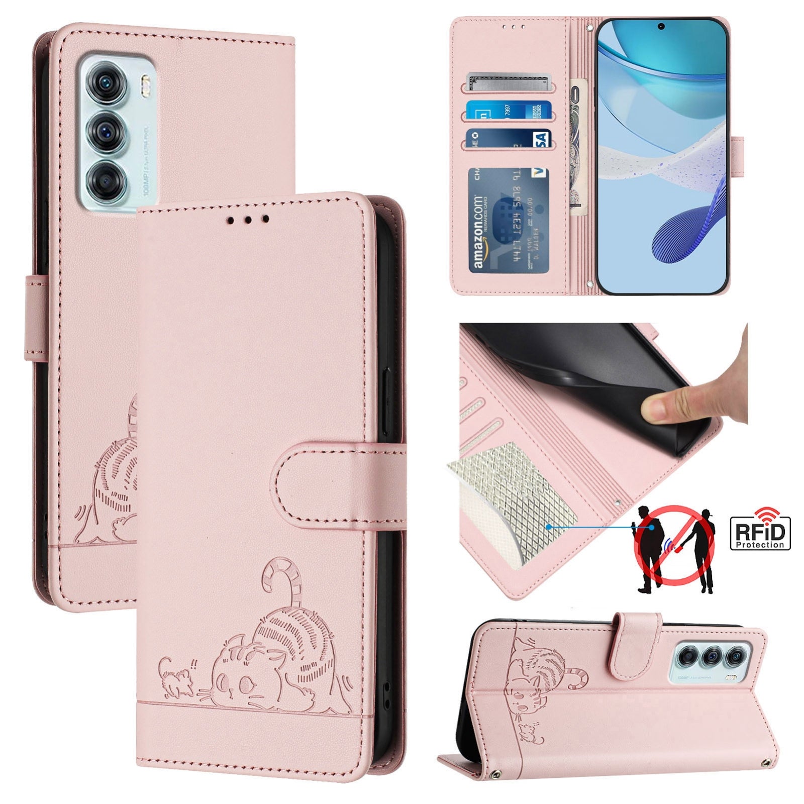 Explore the perfect blend of style and functionality with our Motorola Moto G200 5G Leather Phone Case. Featuring a charming cat and rat embossed pattern, this case offers multiple benefits: