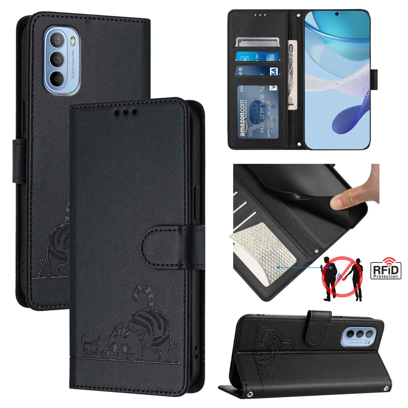 Motorola Moto G31 4G Global Cat and Rat Embossed Pattern, RFID Leather Phone Case with Lanyard, Kickstand, and Wallet Features