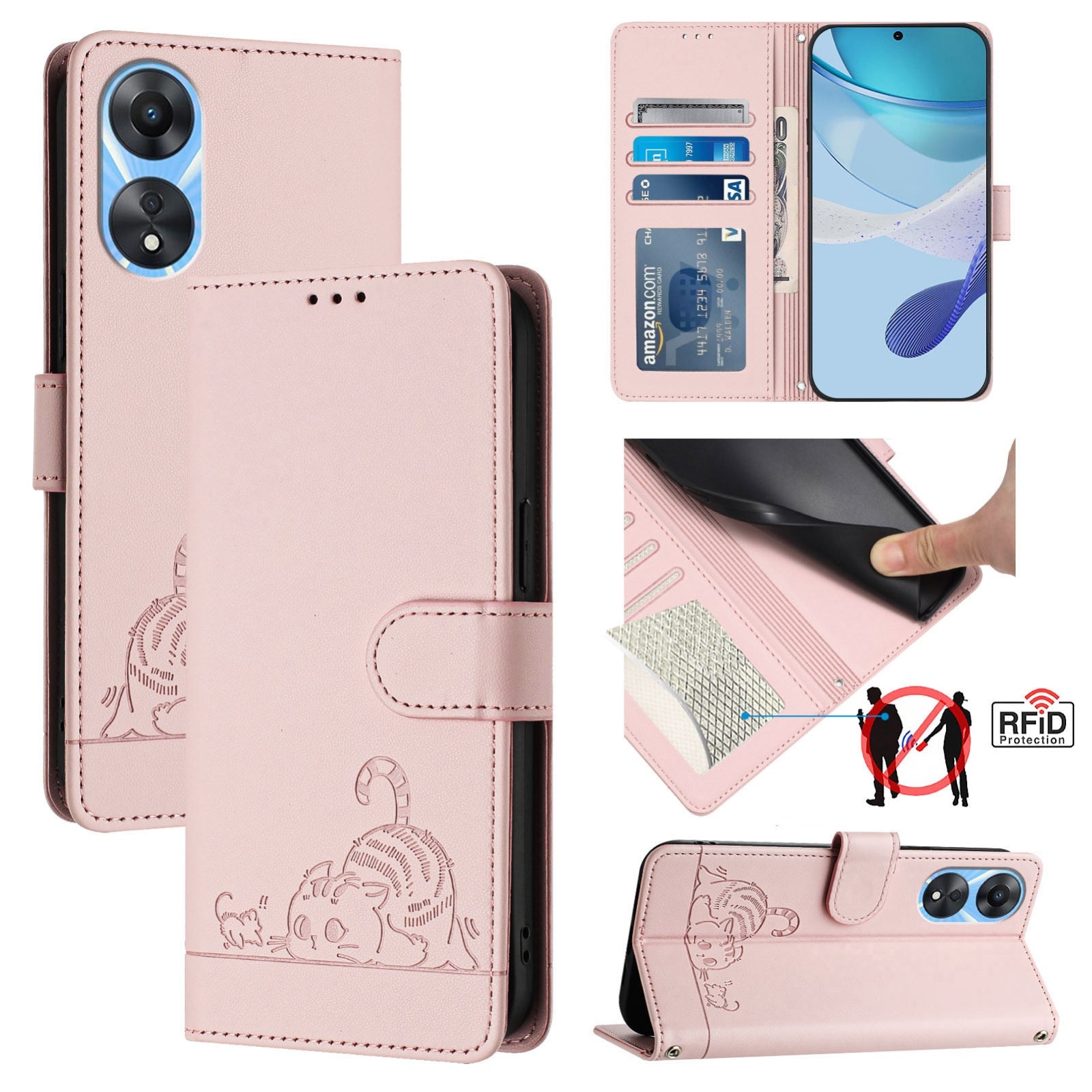 OPPO A78 5G Global Cat and Rat Embossed Pattern, RFID Leather Phone Case with Lanyard, Kickstand, and Wallet Features