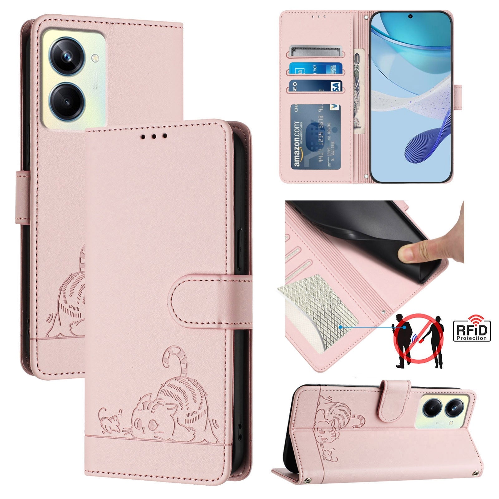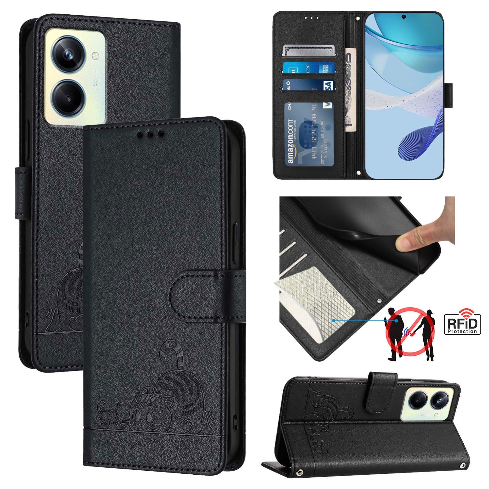 Realme 10 Pro 5G Cat and Rat Embossed Pattern, RFID Leather Phone Case with Lanyard, Kickstand, and Wallet Features