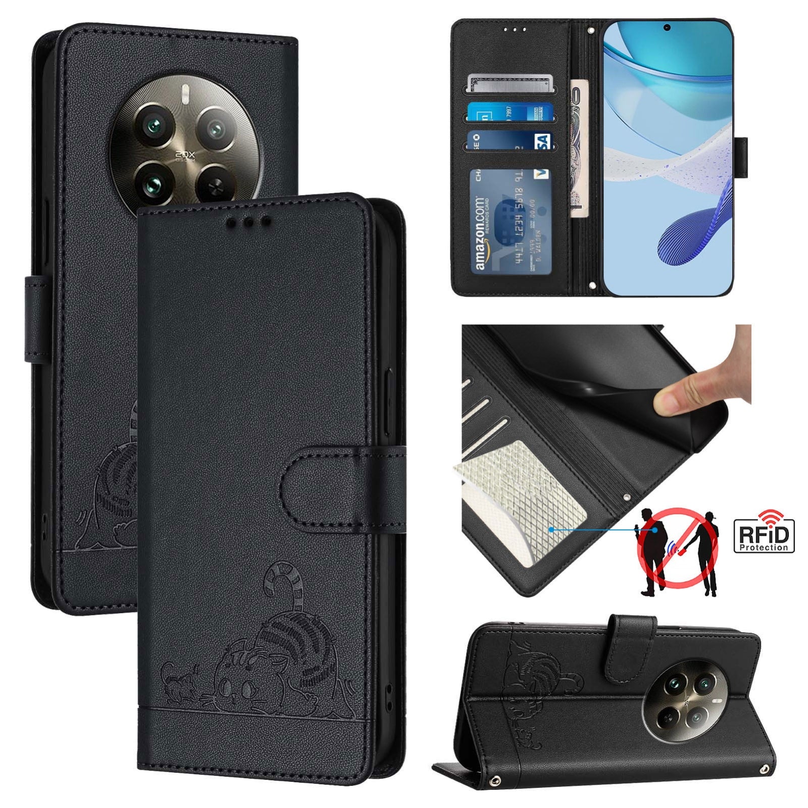 Explore the perfect blend of style and functionality with our Realme 12 Pro+ 5G Global Leather Phone Case. Featuring a charming cat and rat embossed pattern, this case offers multiple benefits: