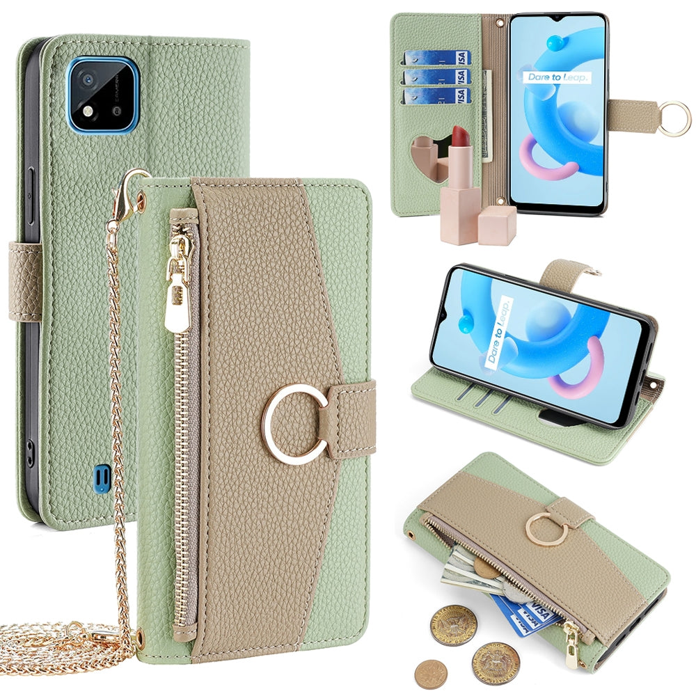 Realme C20 Crossbody Phone Case with Litchi Texture Leather, Adjustable Kickstand, Card Slots, Zipper Purse, Makeup Mirror, and TPU Protection