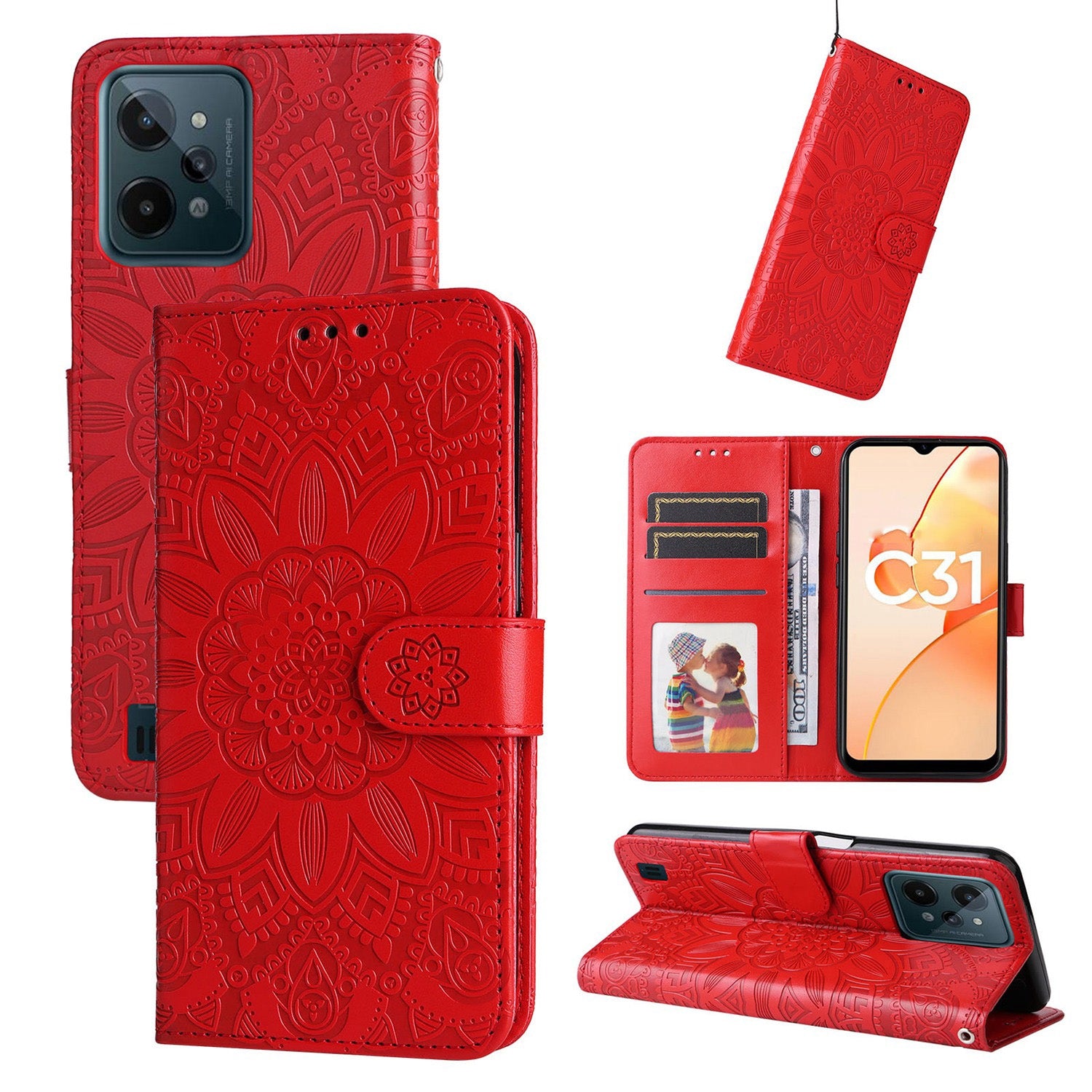Realme C31 Sunflower Embossed Leather Wallet Phone Case with Kickstand and Card Holder