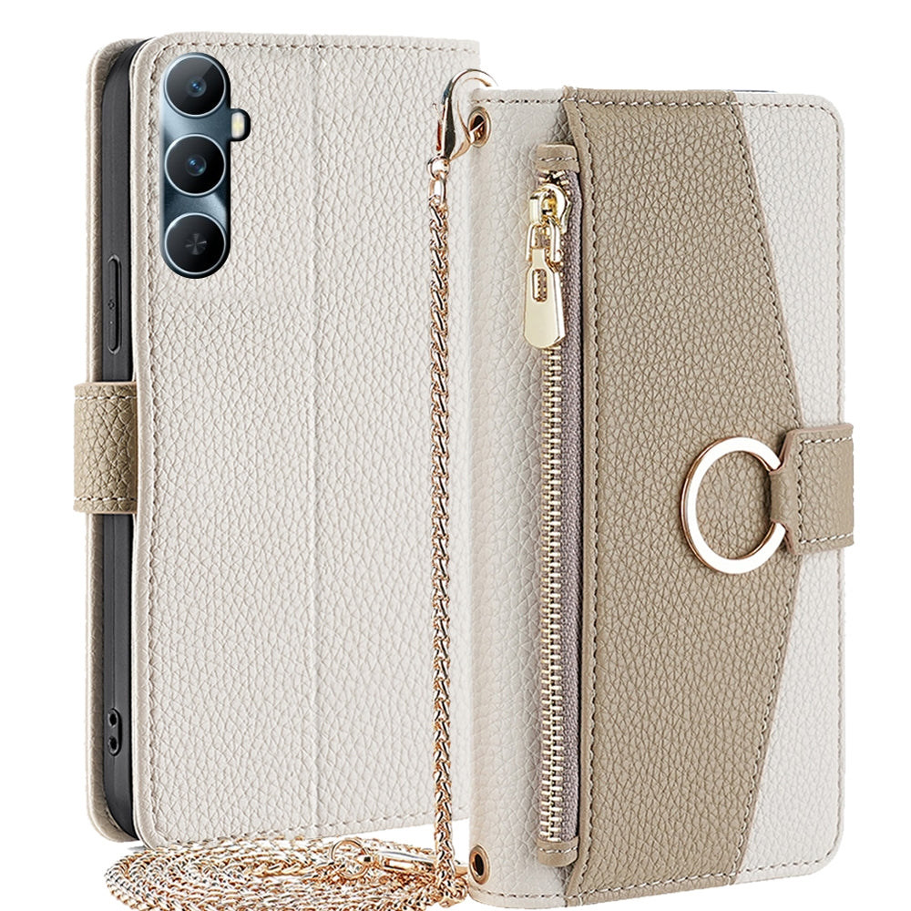 Realme C65 4G Crossbody Phone Case with Litchi Texture Leather, Adjustable Kickstand, Card Slots, Zipper Purse, Makeup Mirror, and TPU Protection