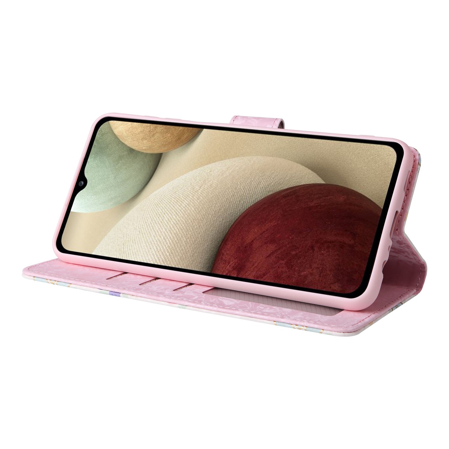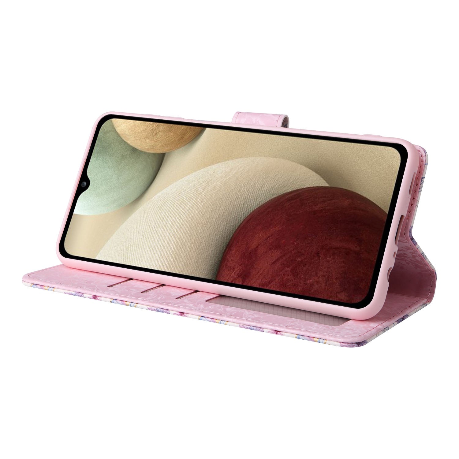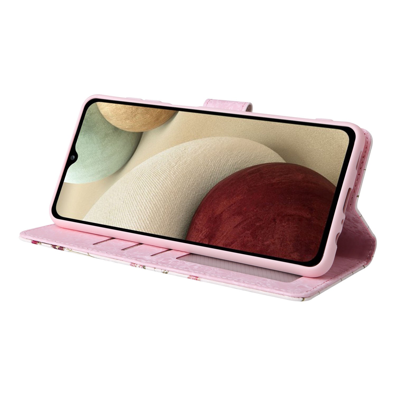Samsung Galaxy A12 Luxury Bronzing Leather Case - Floral RFID Wallet Cover with Stand & Card Slots