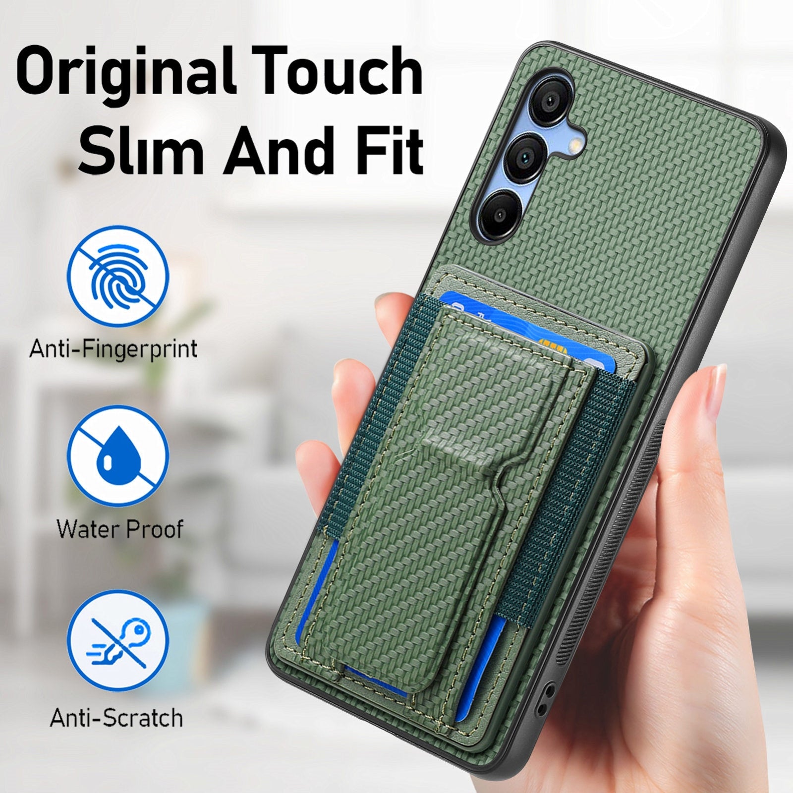 Samsung Galaxy A13 5G Carbon Fiber Fold Stand Elastic Card Bag Phone Case with Multi-Functional Wallet