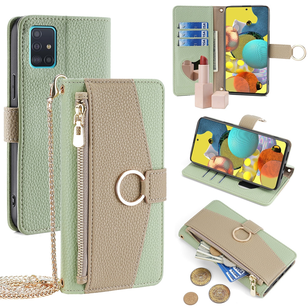 Samsung Galaxy A51 Crossbody Phone Case with Litchi Texture Leather, Adjustable Kickstand, Card Slots, Zipper Purse, Makeup Mirror, and TPU Protection