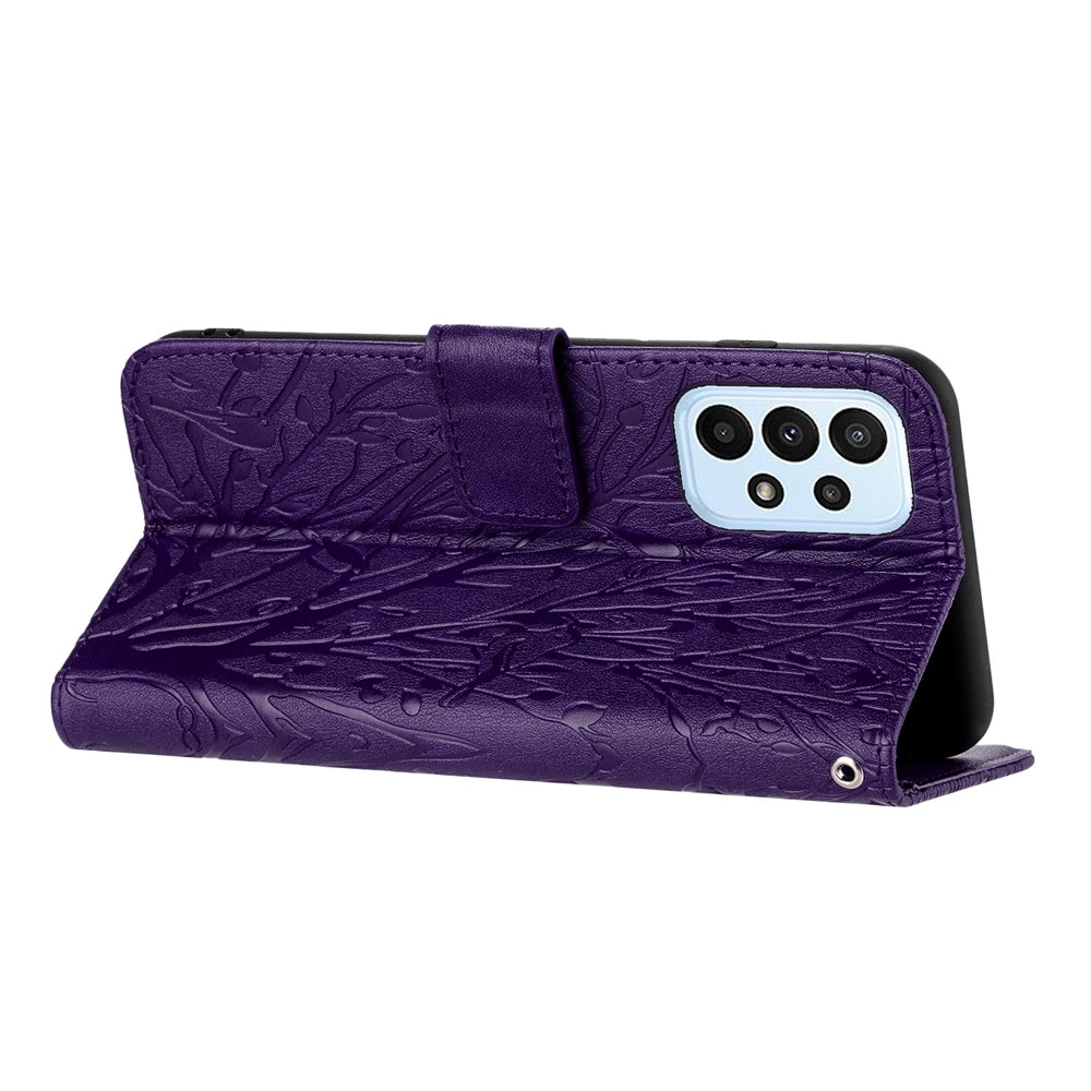 Samsung Galaxy A52 5G Embossed Leather Phone Case with Tree Birds Pattern, Hand Strap, Card Holder & Adjustable Stand - Shockproof Wallet Cover