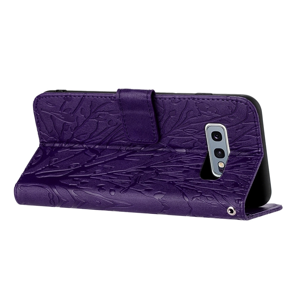 Samsung Galaxy S10e Embossed Leather Phone Case with Tree Birds Pattern, Hand Strap, Card Holder & Adjustable Stand - Shockproof Wallet Cover