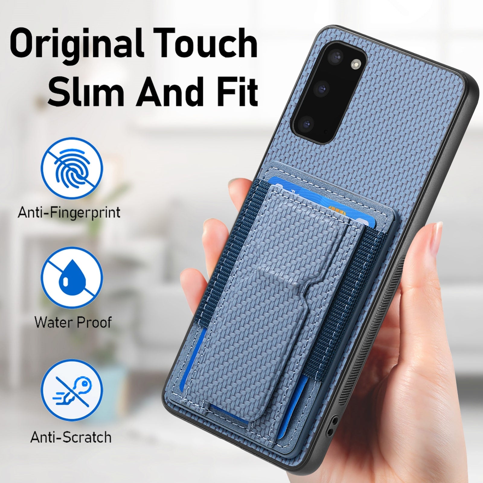 Samsung Galaxy S20 Carbon Fiber Fold Stand Elastic Card Bag Phone Case with Multi-Functional Wallet