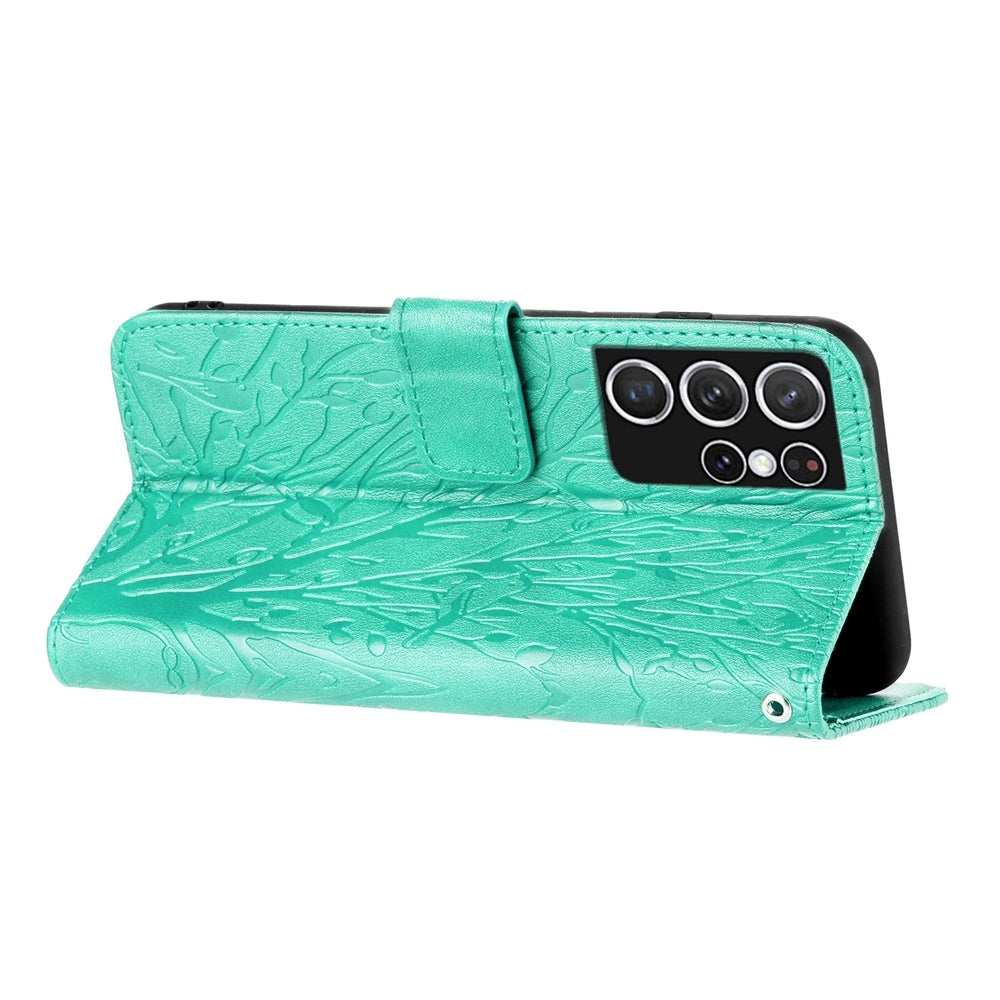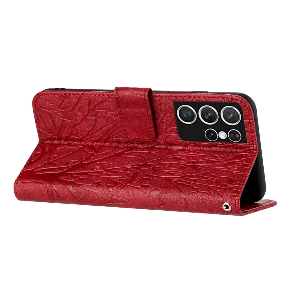 Samsung Galaxy S21 Ultra 5G Embossed Leather Phone Case with Tree Birds Pattern, Hand Strap, Card Holder & Adjustable Stand - Shockproof Wallet Cover