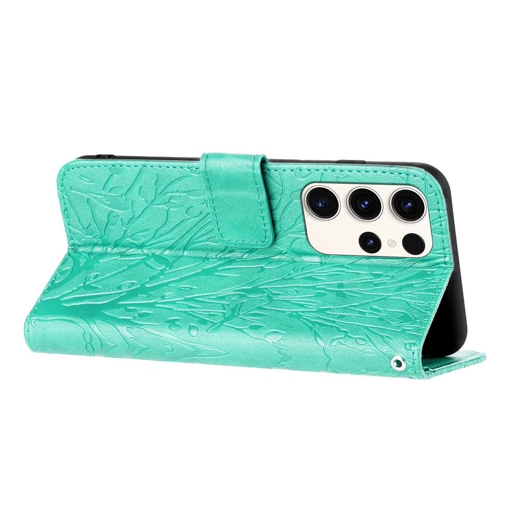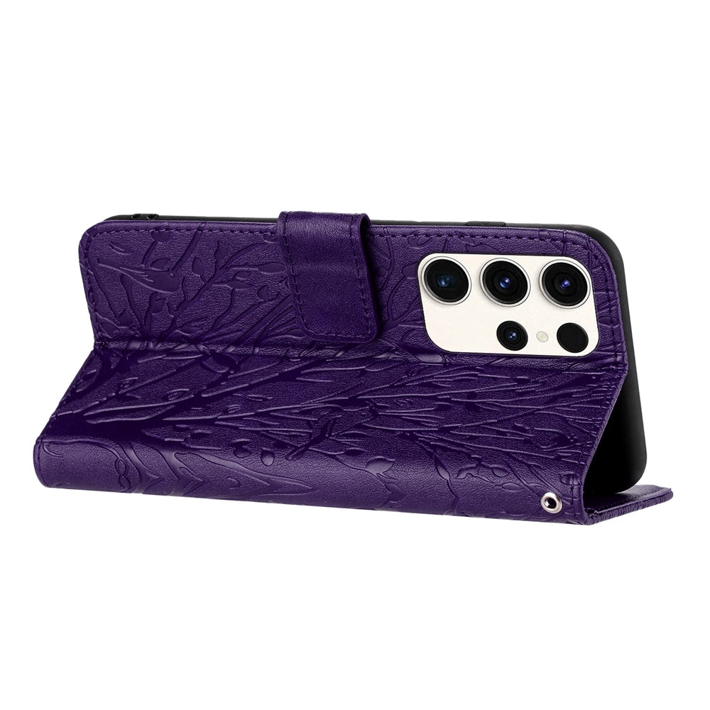 Samsung Galaxy S22 Ultra 5G Embossed Leather Phone Case with Tree Birds Pattern, Hand Strap, Card Holder & Adjustable Stand - Shockproof Wallet Cover