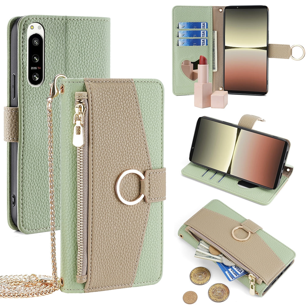 Sony Xperia 5 IV Crossbody Phone Case with Litchi Texture Leather, Adjustable Kickstand, Card Slots, Zipper Purse, Makeup Mirror, and TPU Protection