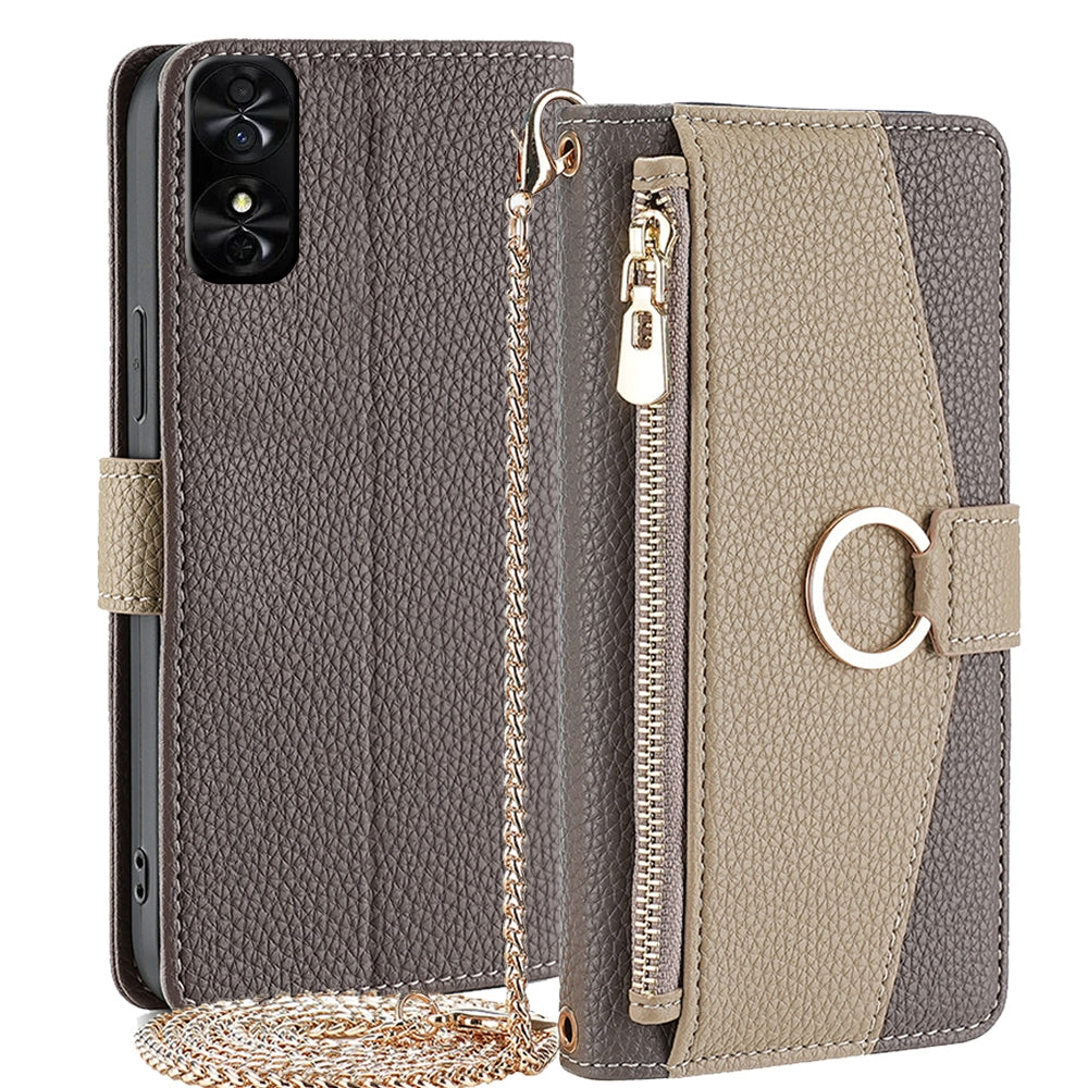 TCL 50 SE 4G Crossbody Phone Case with Litchi Texture Leather, Adjustable Kickstand, Card Slots, Zipper Purse, Makeup Mirror, and TPU Protection