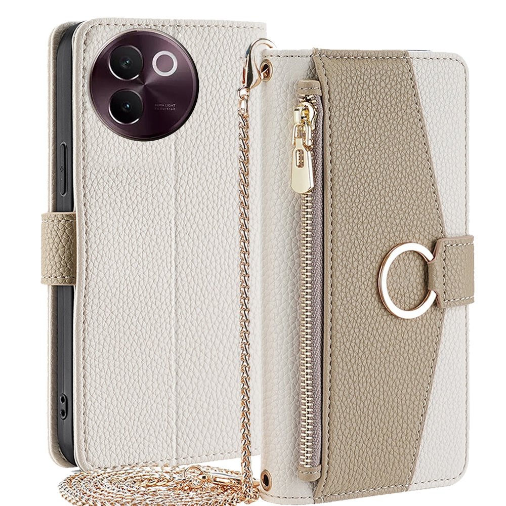 vivo V30e 5G Global Crossbody Phone Case with Litchi Texture Leather, Adjustable Kickstand, Card Slots, Zipper Purse, Makeup Mirror, and TPU Protection