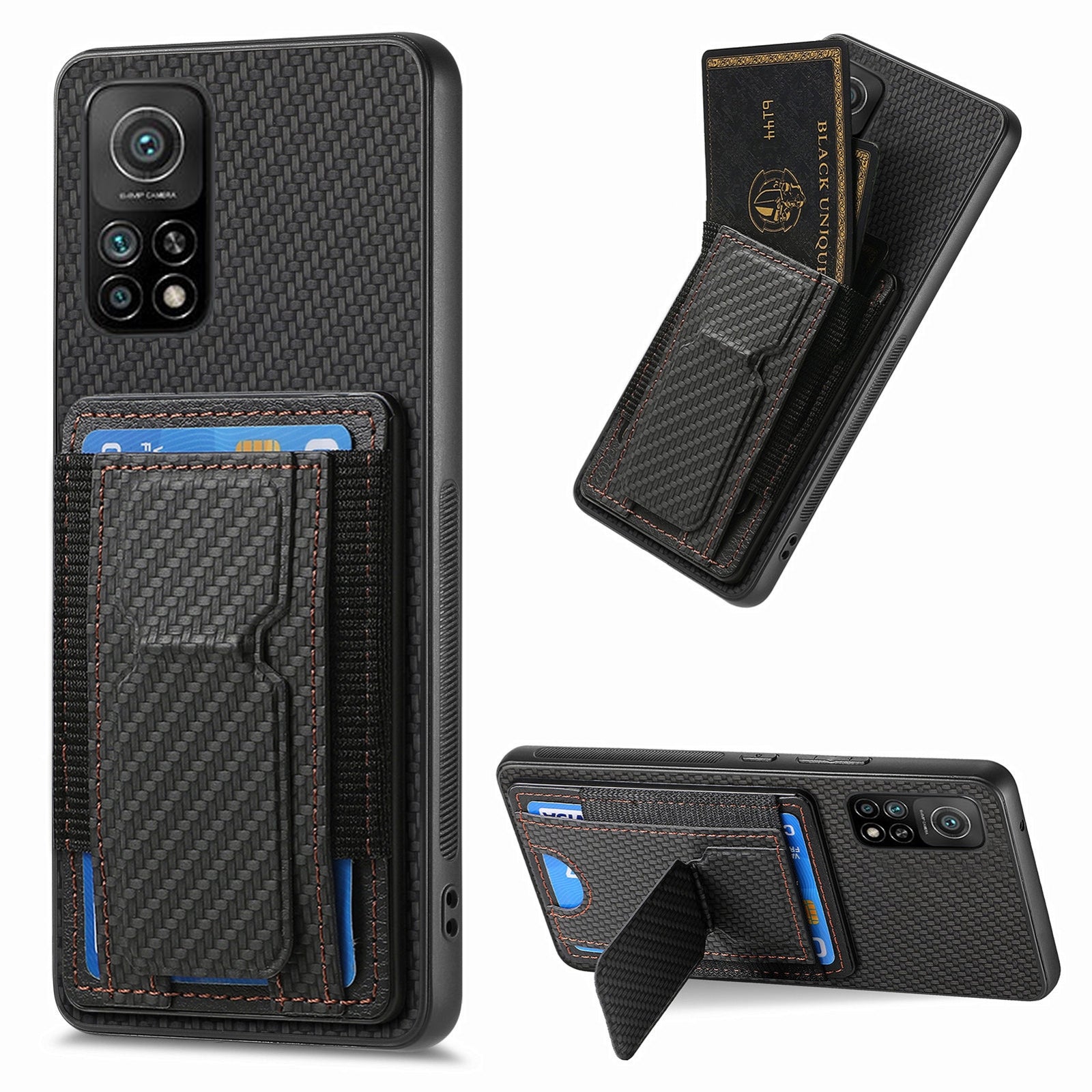 Xiaomi Mi 10T 5G Carbon Fiber Fold Stand Elastic Card Bag Phone Case with Multi-Functional Wallet