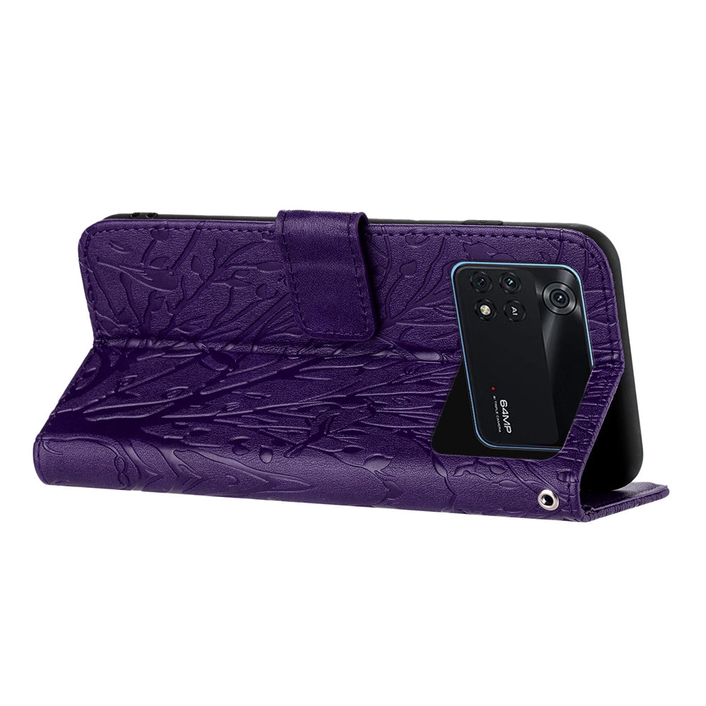 Xiaomi Poco M4 Pro 4G Embossed Leather Phone Case with Tree Birds Pattern, Hand Strap, Card Holder & Adjustable Stand - Shockproof Wallet Cover
