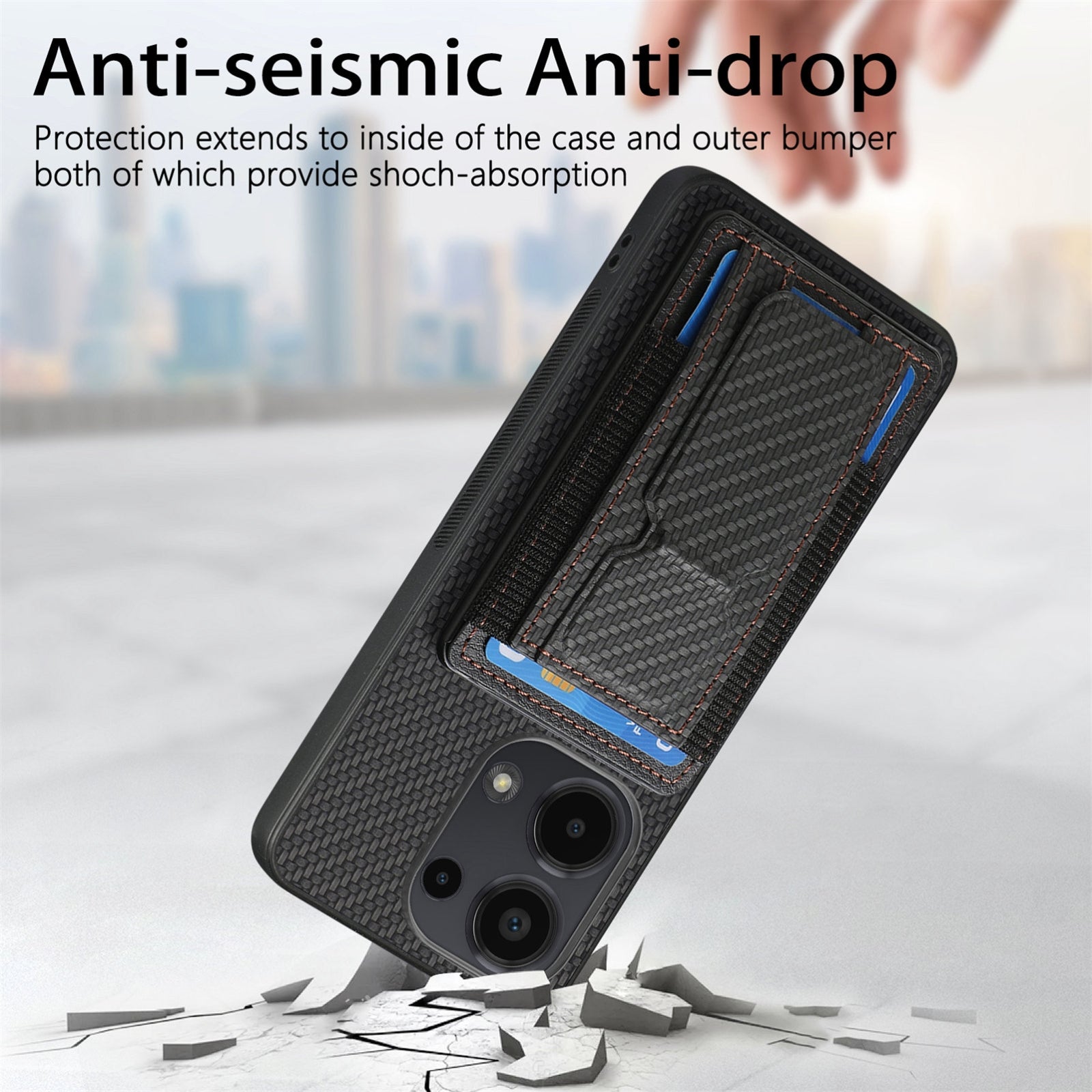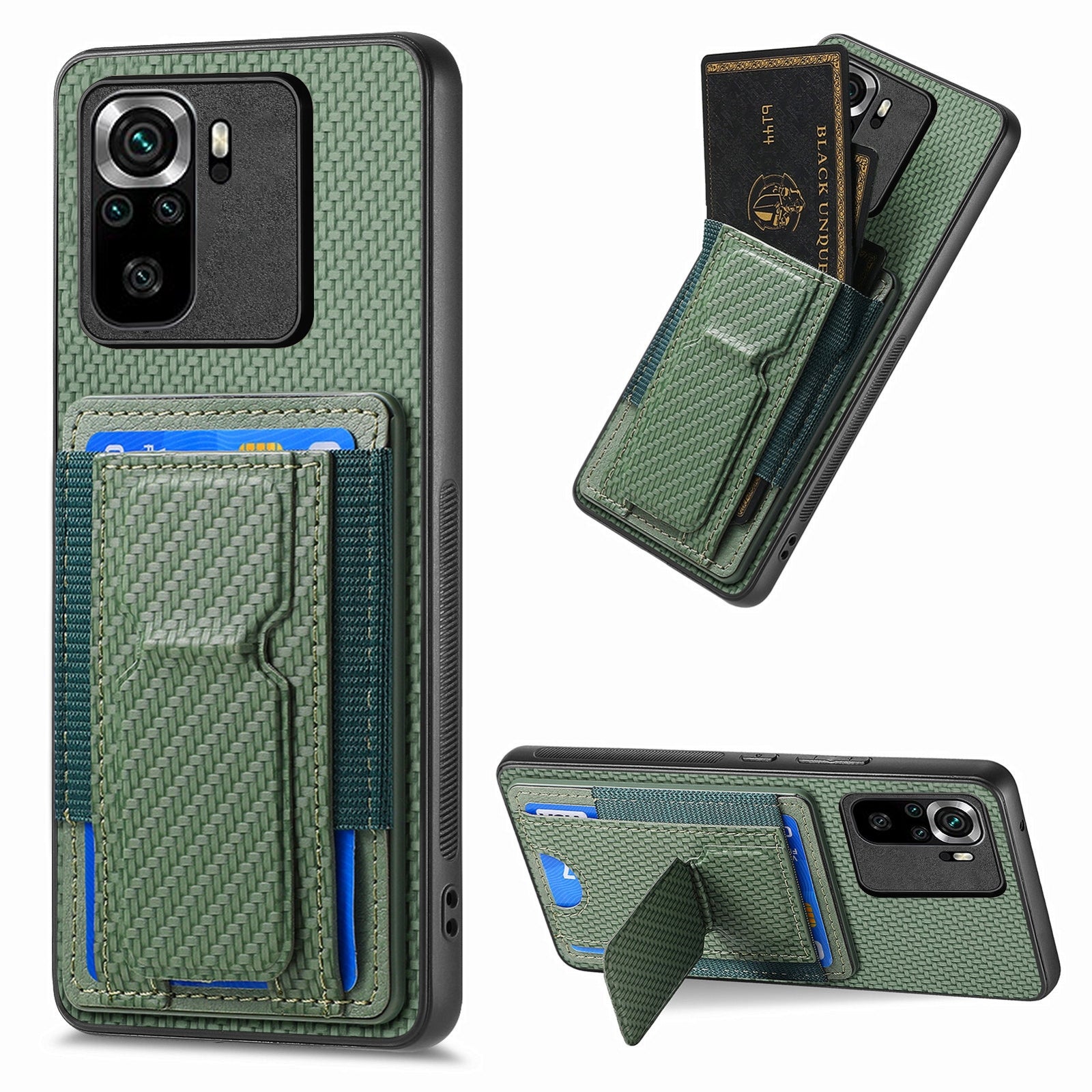 Xiaomi Poco M5s 4G Carbon Fiber Fold Stand Elastic Card Bag Phone Case with Multi-Functional Wallet