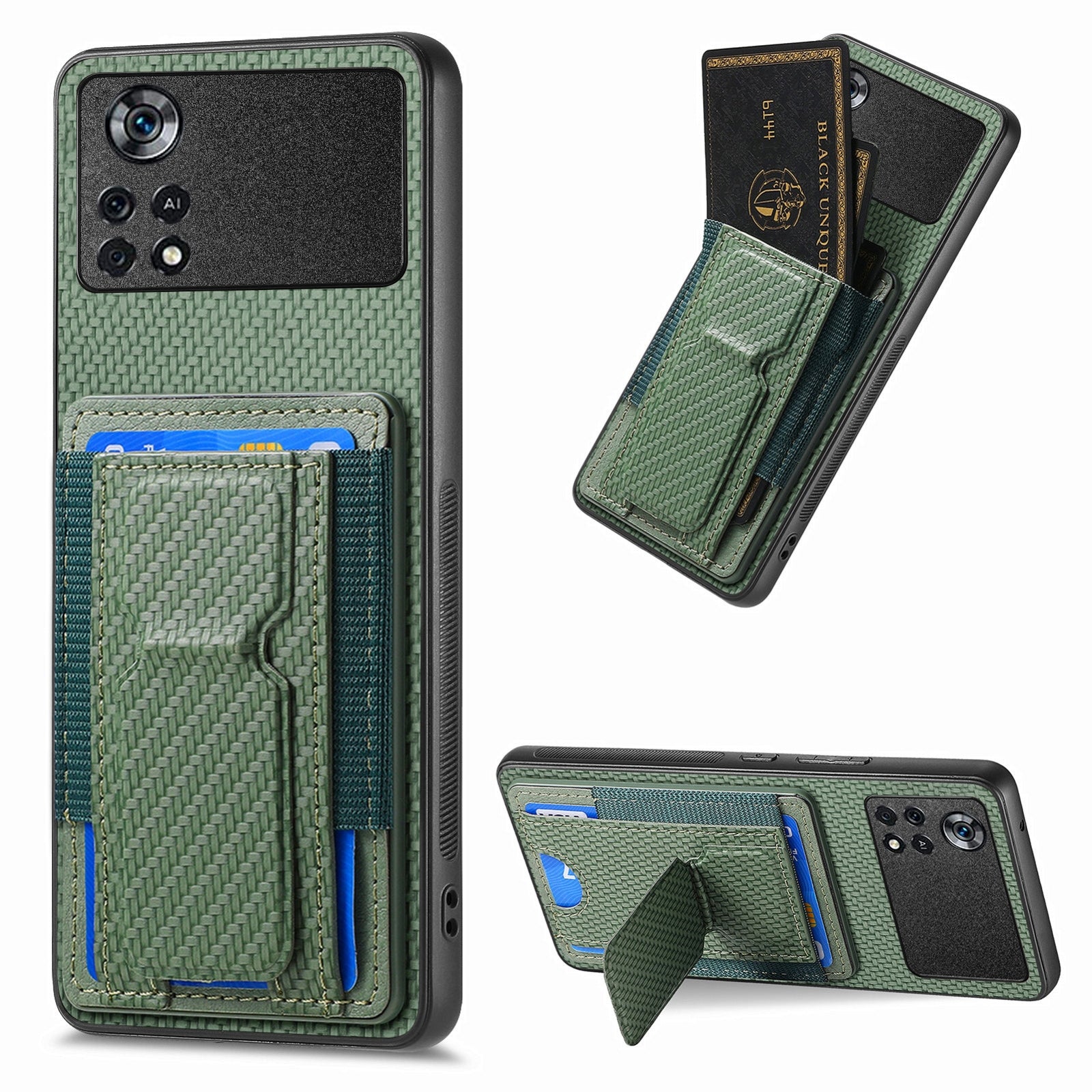 Xiaomi Poco X4 Pro 5G Carbon Fiber Fold Stand Elastic Card Bag Phone Case with Multi-Functional Wallet
