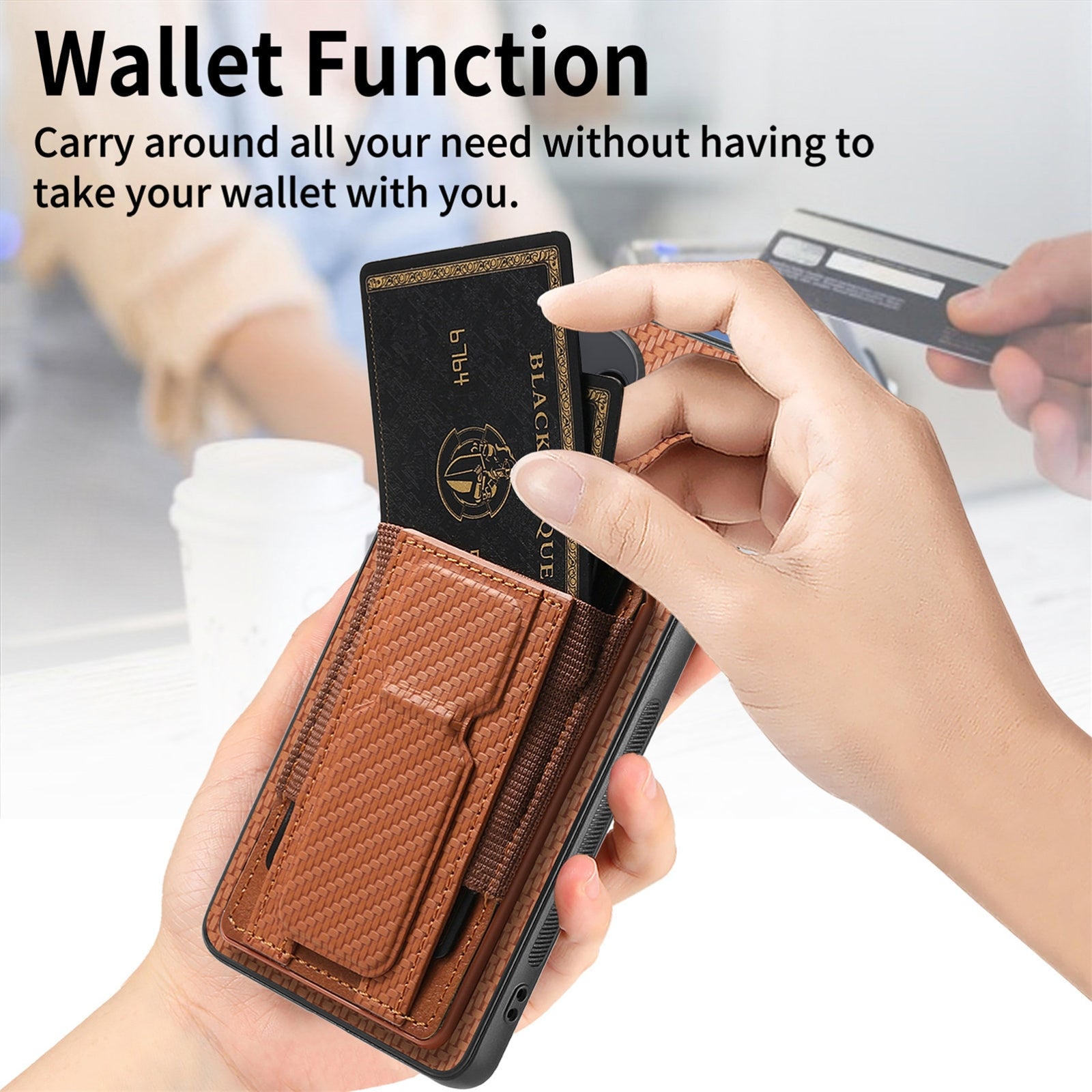 Xiaomi Poco X5 Pro Carbon Fiber Fold Stand Elastic Card Bag Phone Case with Multi-Functional Wallet