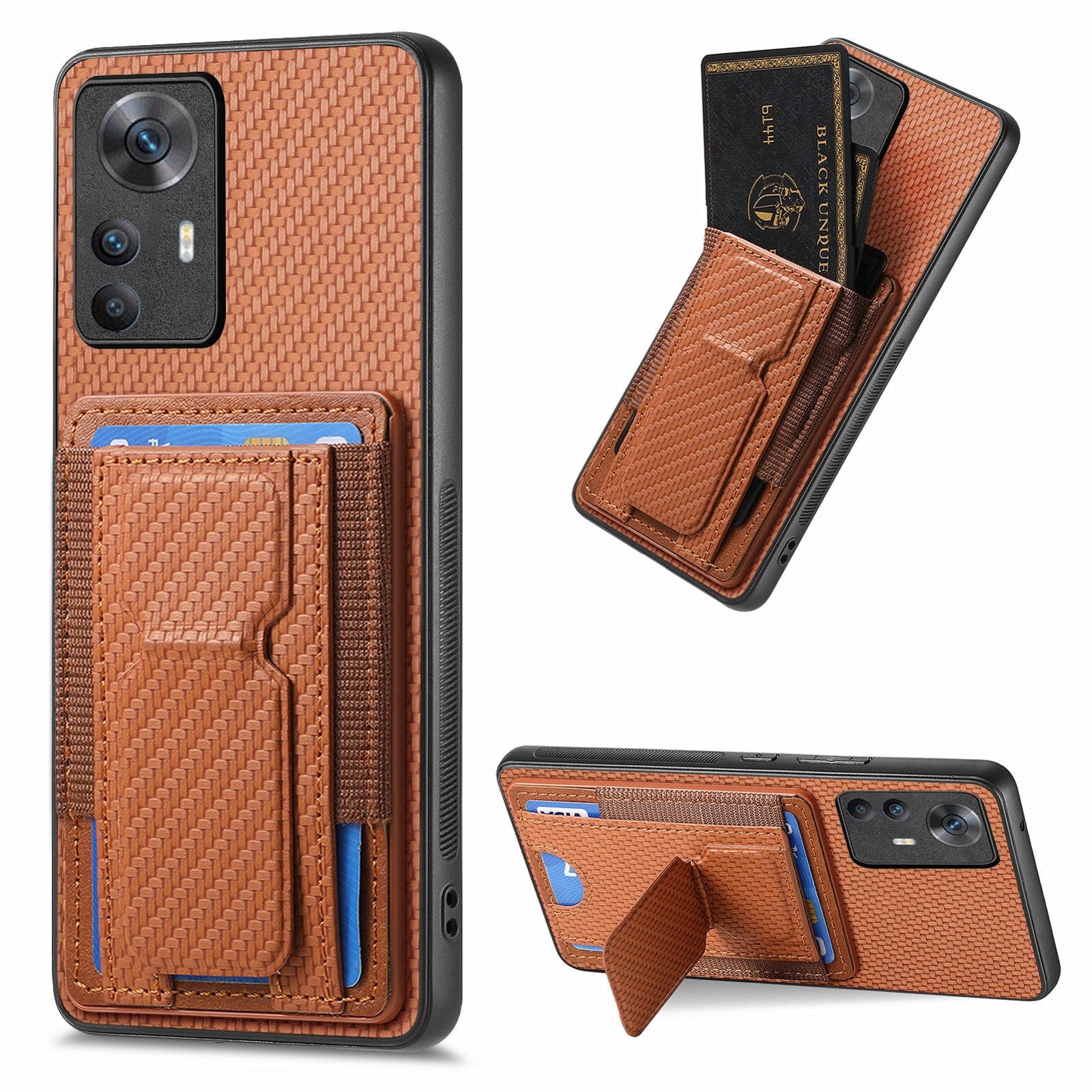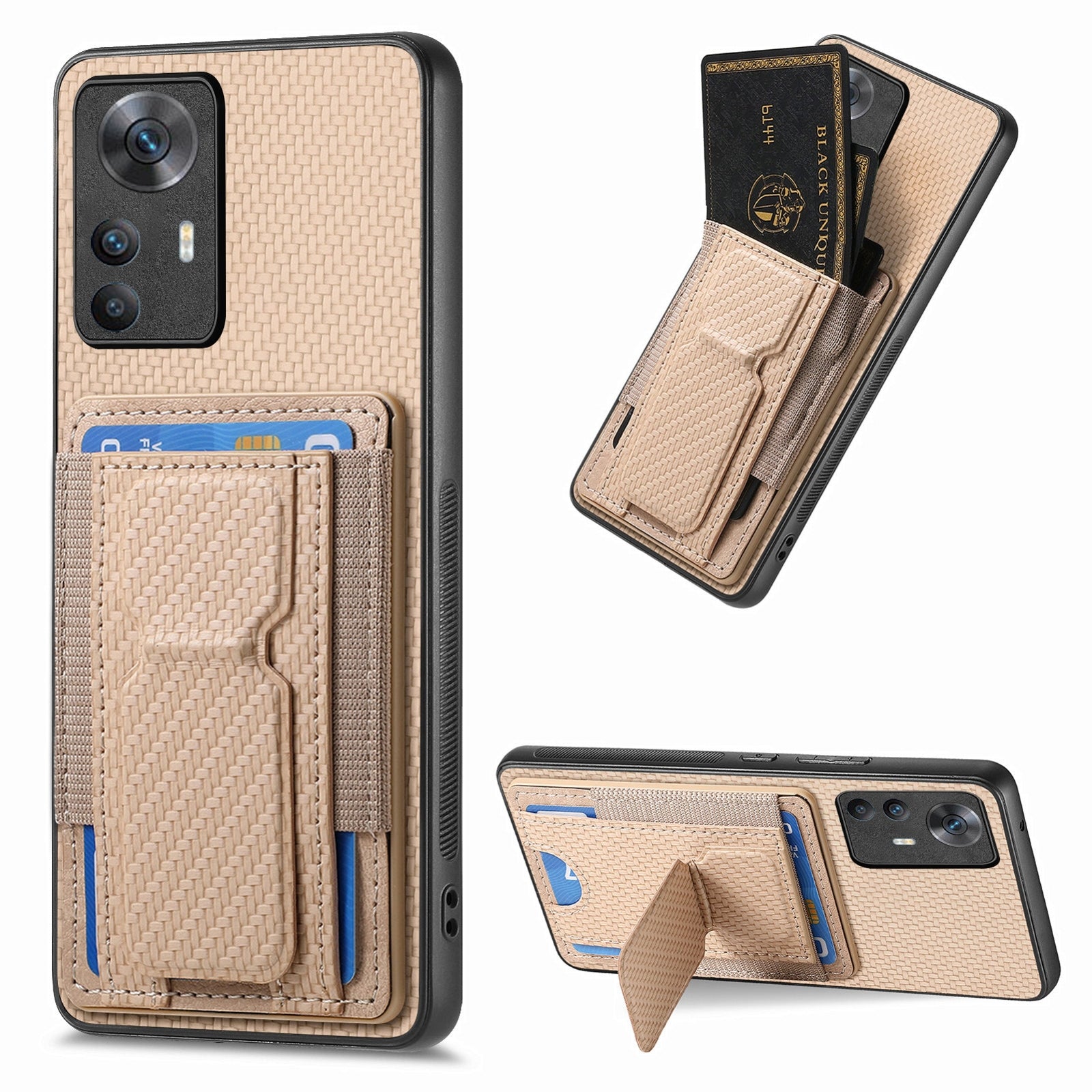 Xiaomi Redmi K50 Ultra Carbon Fiber Fold Stand Elastic Card Bag Phone Case with Multi-Functional Wallet