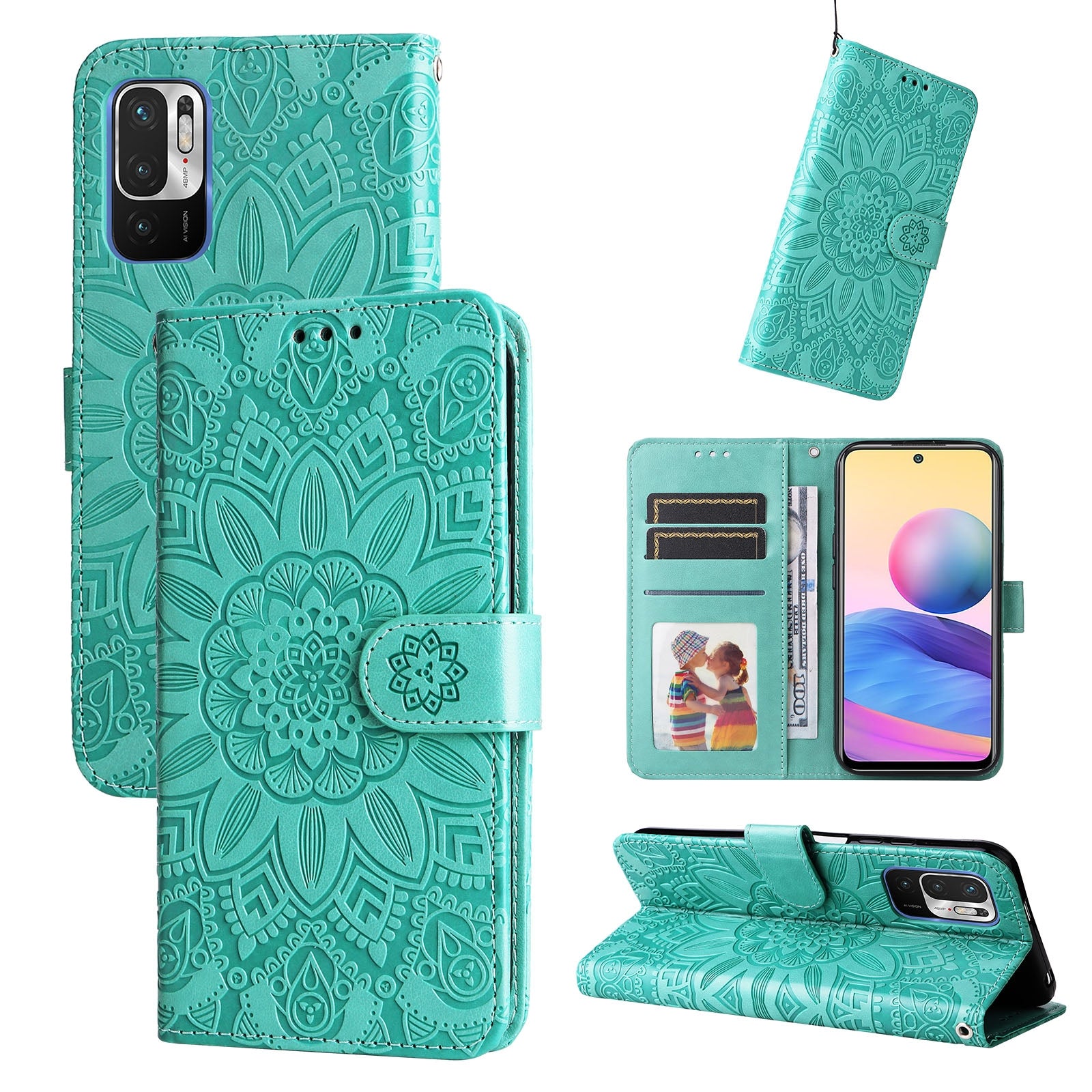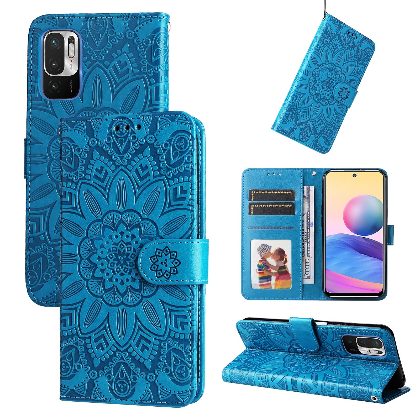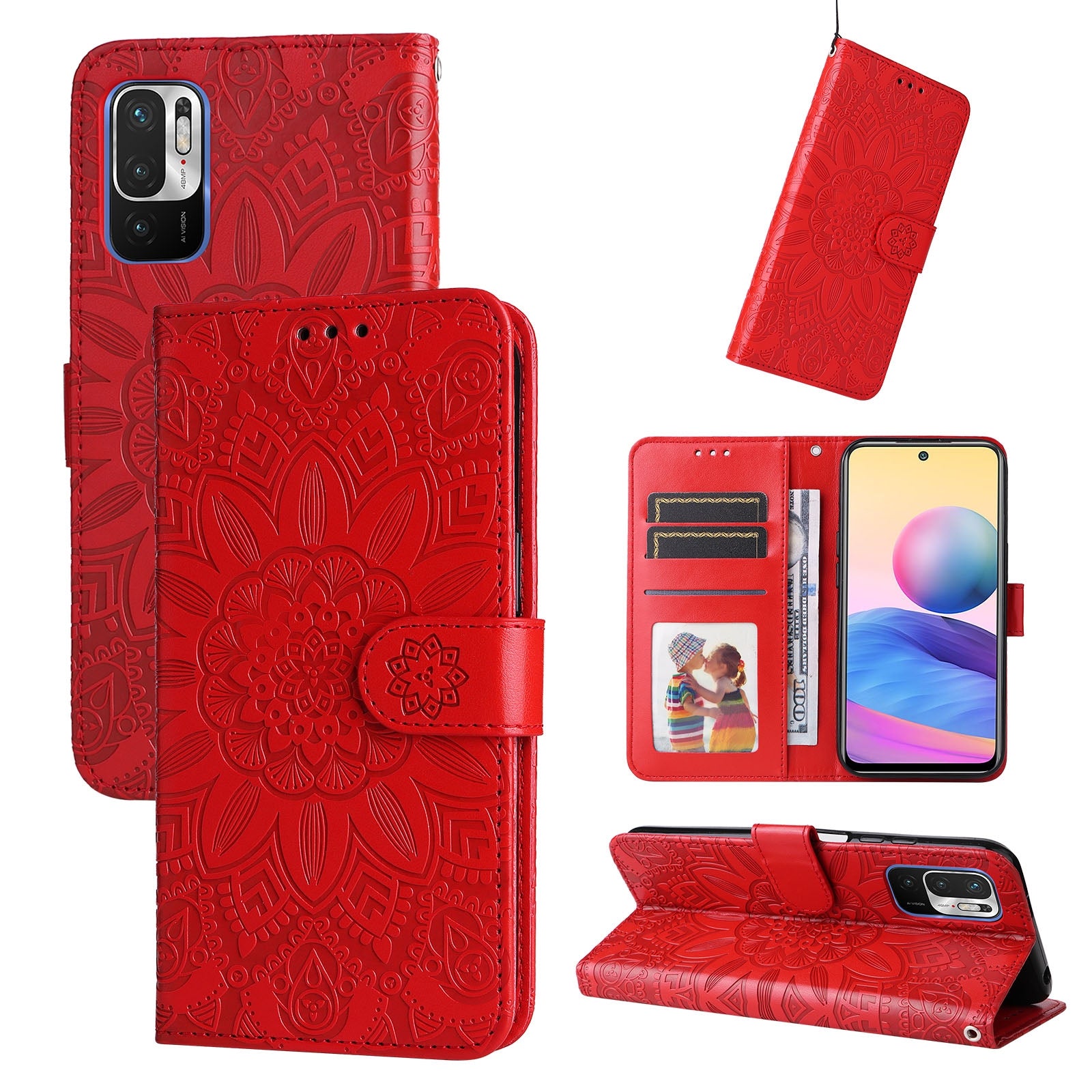 Xiaomi Redmi Note 10 5G Sunflower Embossed Leather Wallet Phone Case with Kickstand and Card Holder